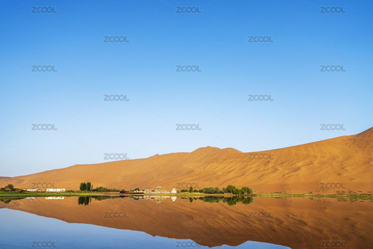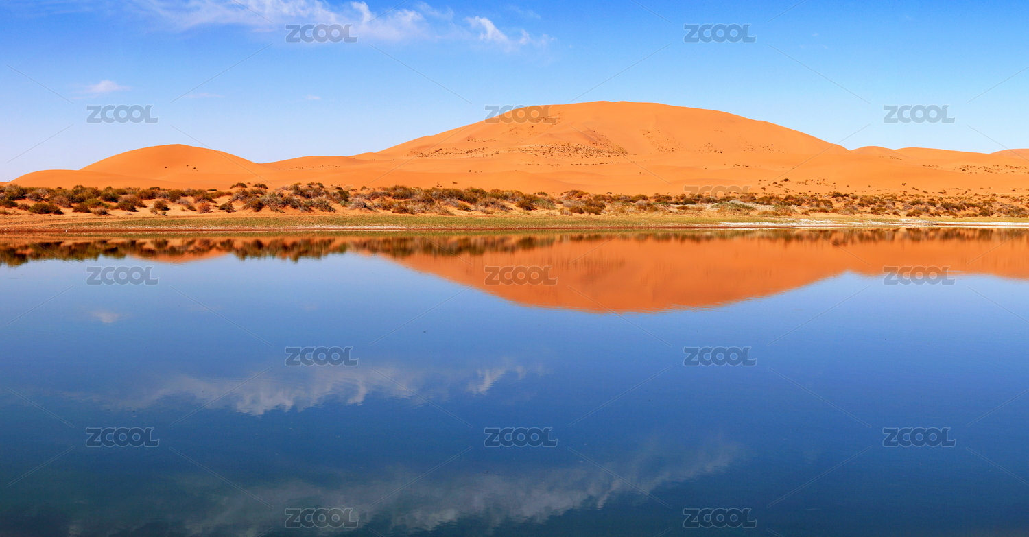中国内蒙古腾格里沙漠太阳湖沙丘晴天倒影