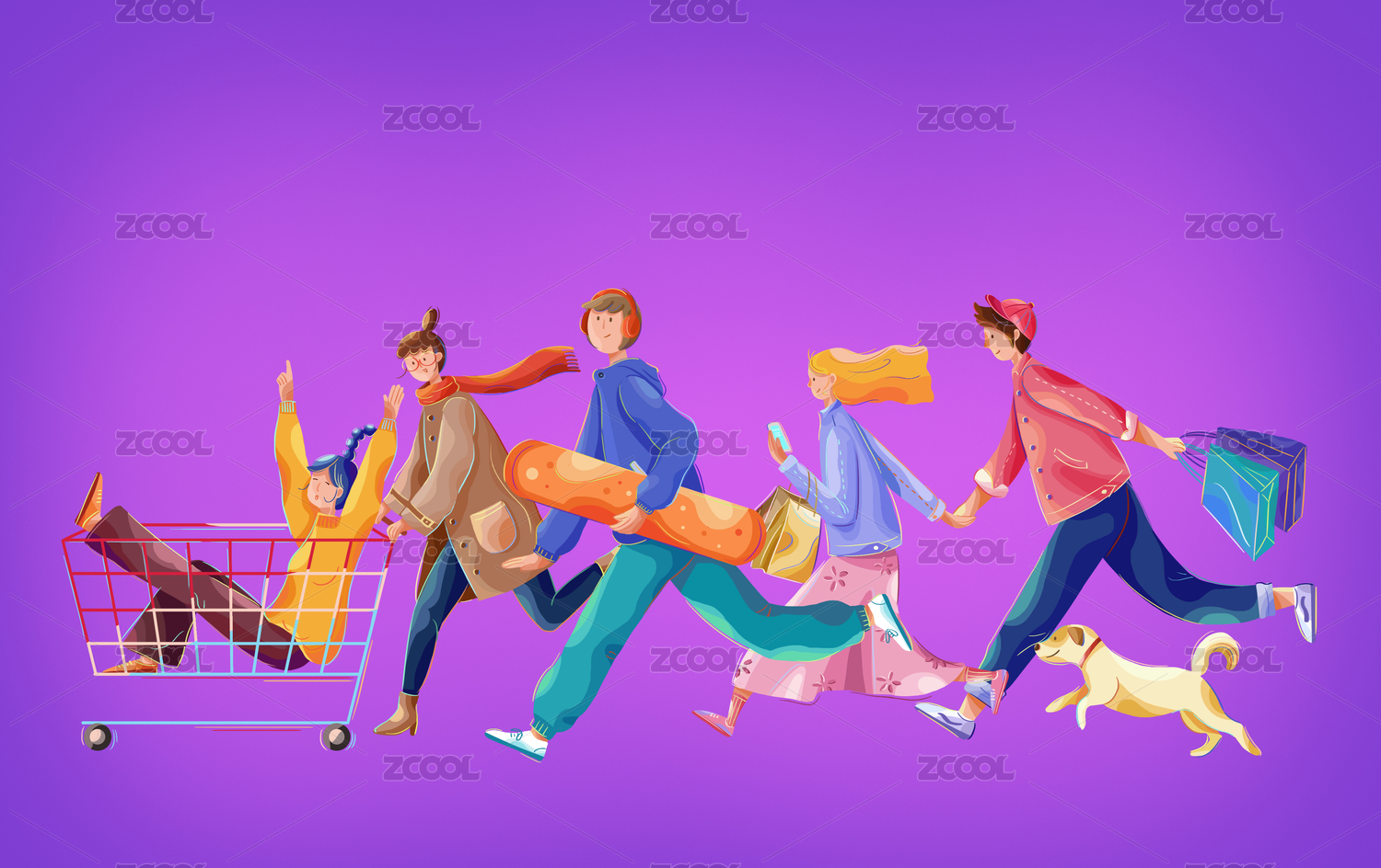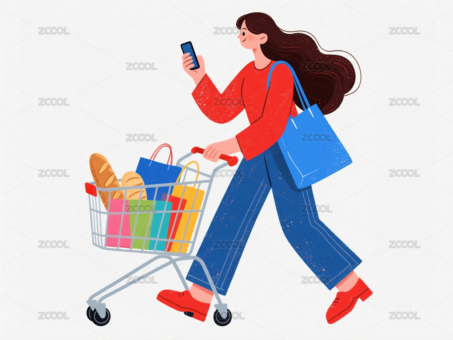 卡通手绘人物购物素材买东西购物车电商人物集合插画
