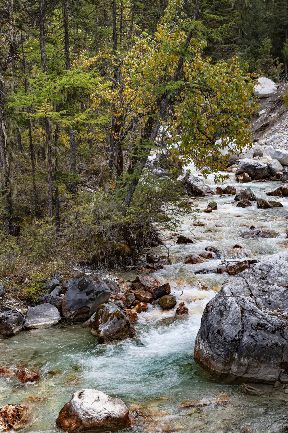 四川甘孜州康定雅拉雪山下的山溪彩林
