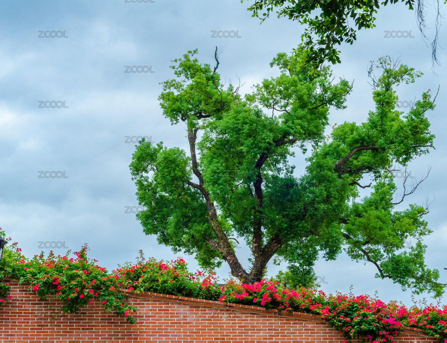 红花绿树和阴云天