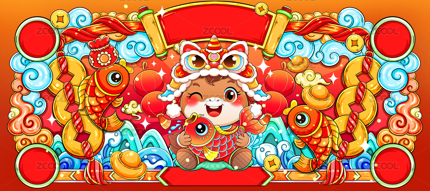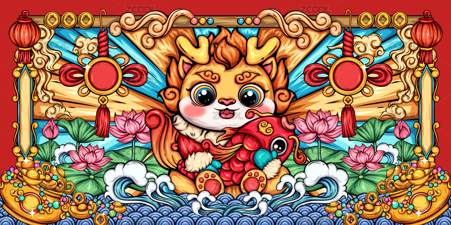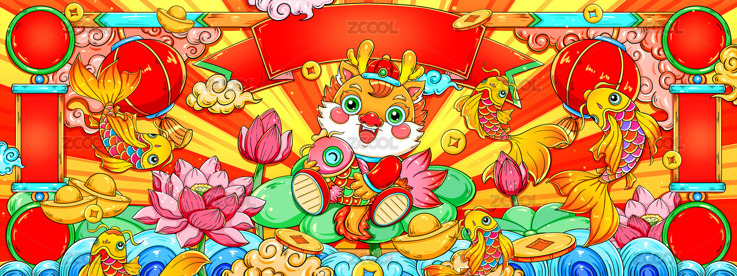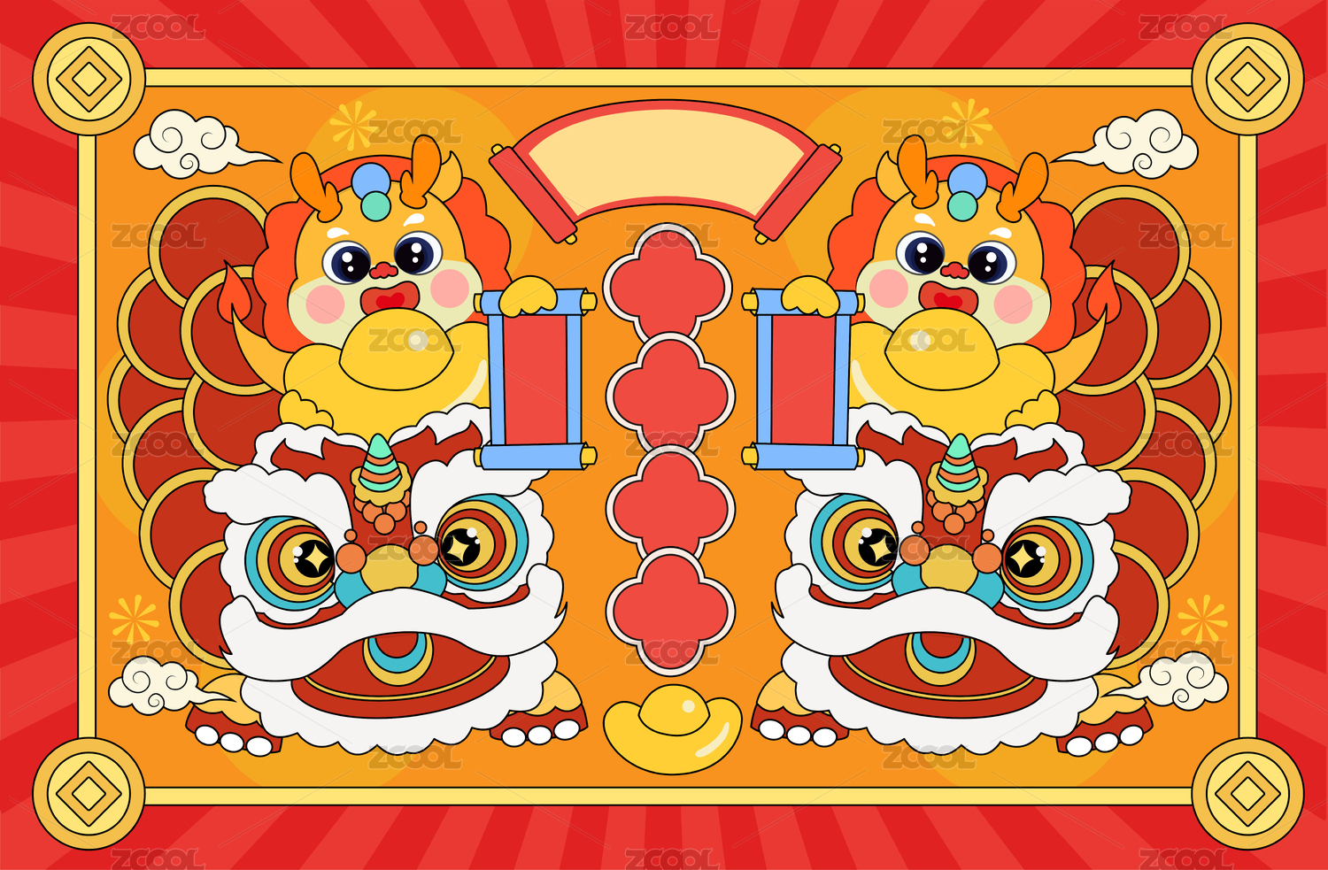 国潮喜庆龙年春节舞龙福龙贺春插画