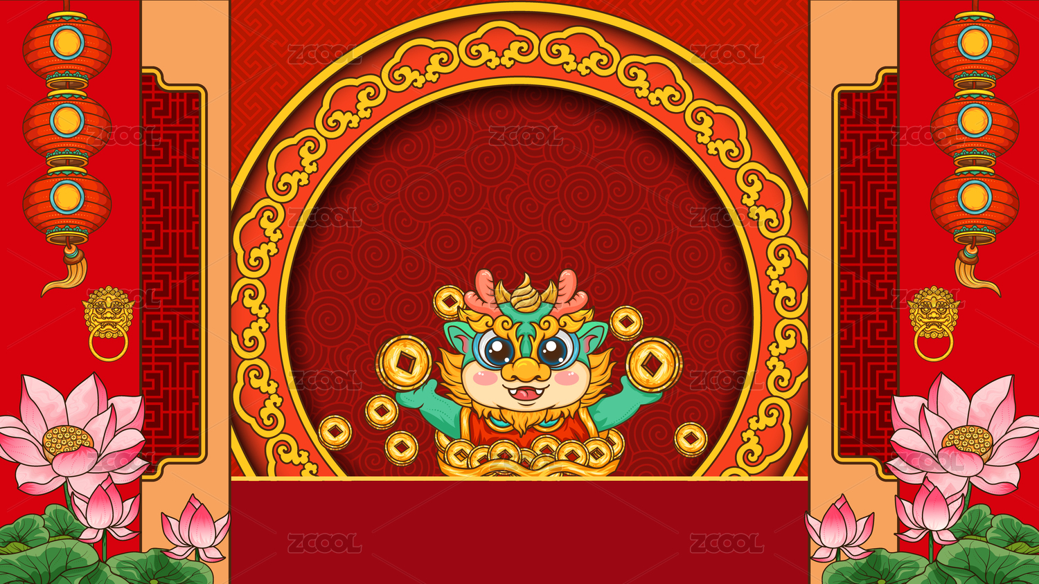 龙年矢量灯笼开门红喷钱枪荷花中国红背景墙