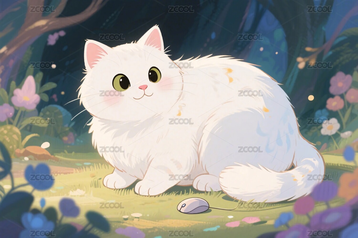 白色猫咪森林插画