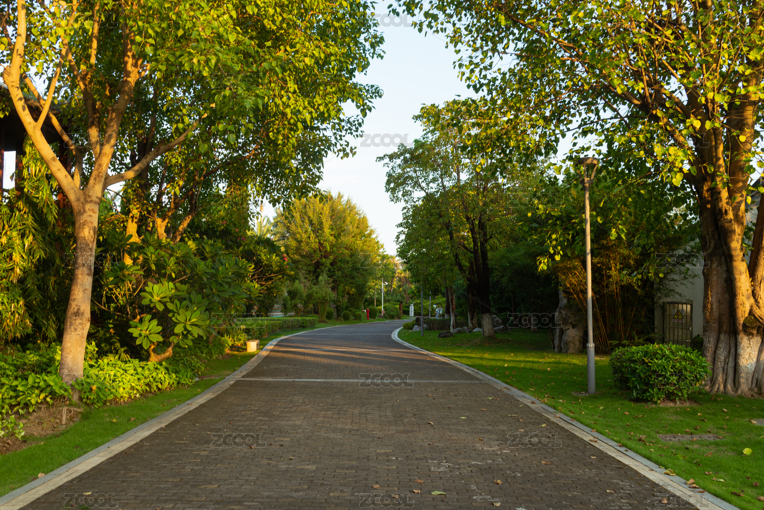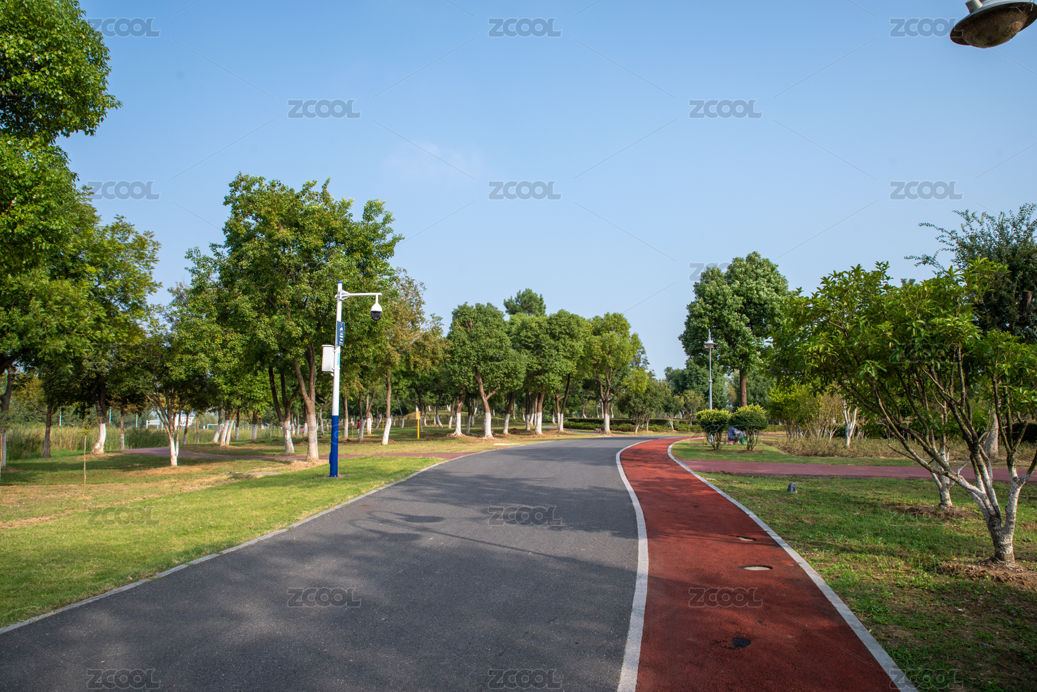 夕阳下的城市公园柏油路绿道,适合跑步健身