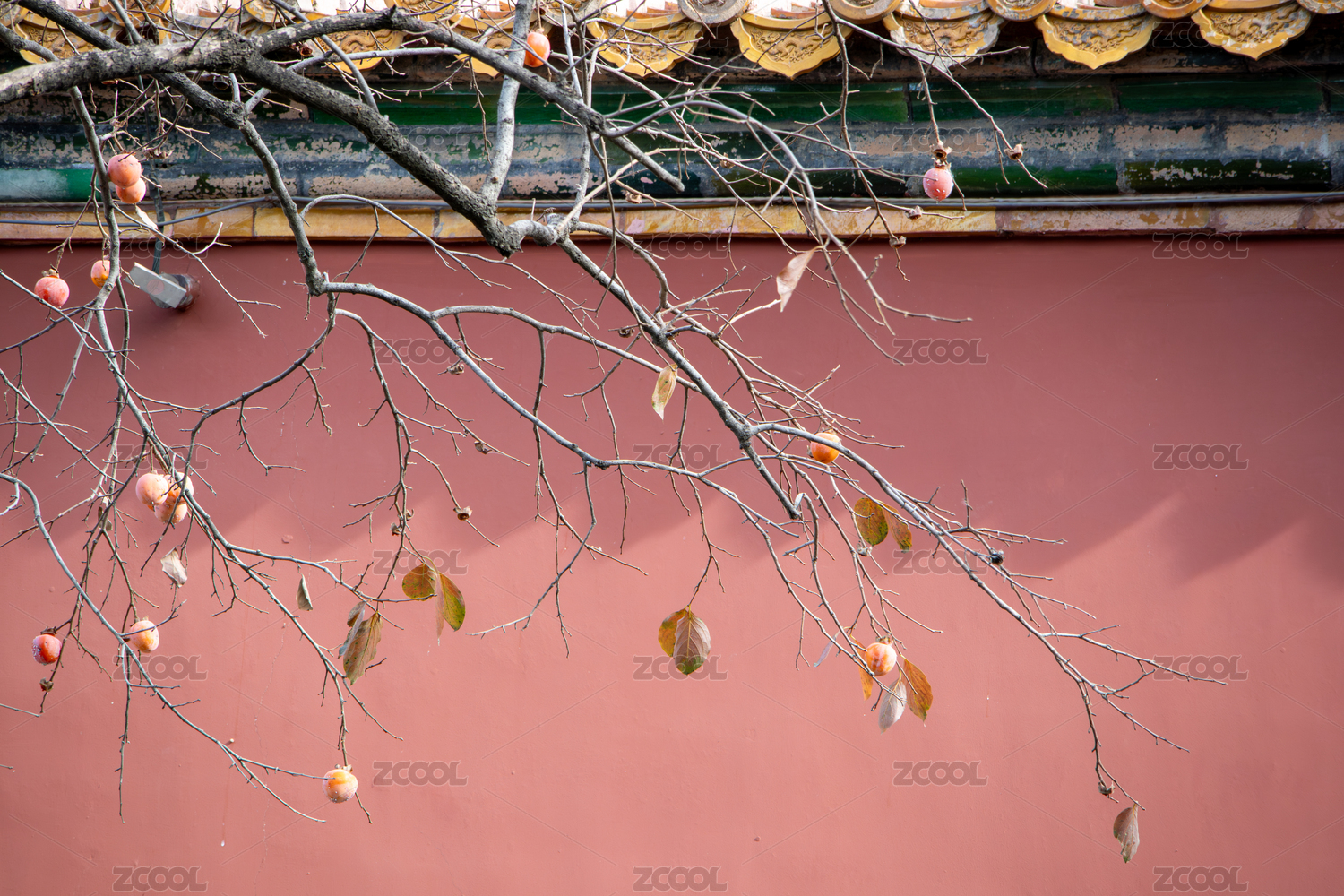 阳光下的古建筑朱红色外墙上的光影和爬山虎植物