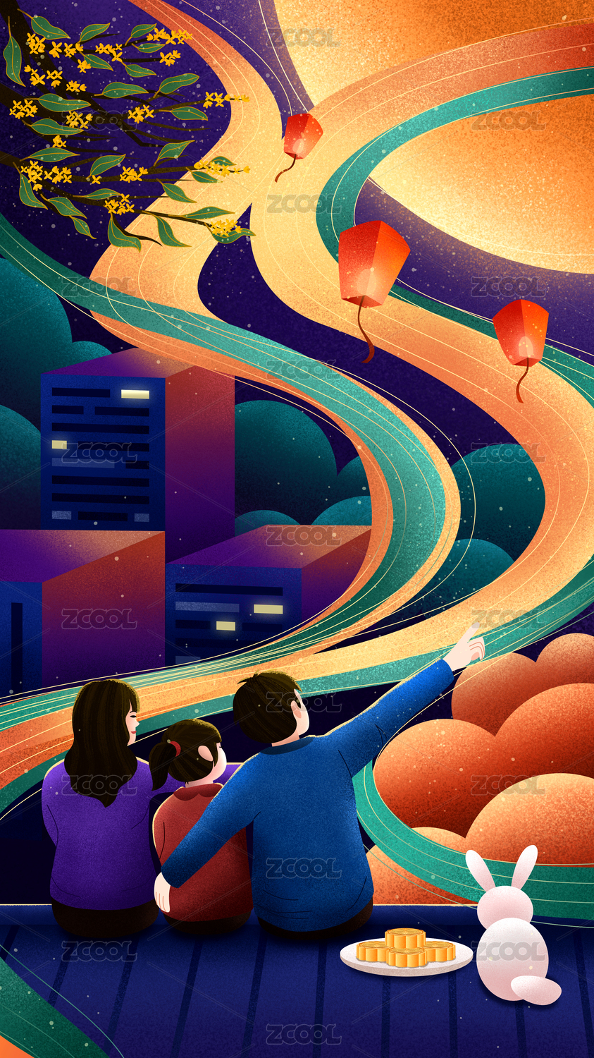 女孩和兔子在万家灯火夜幕下坐在山坡上赏月