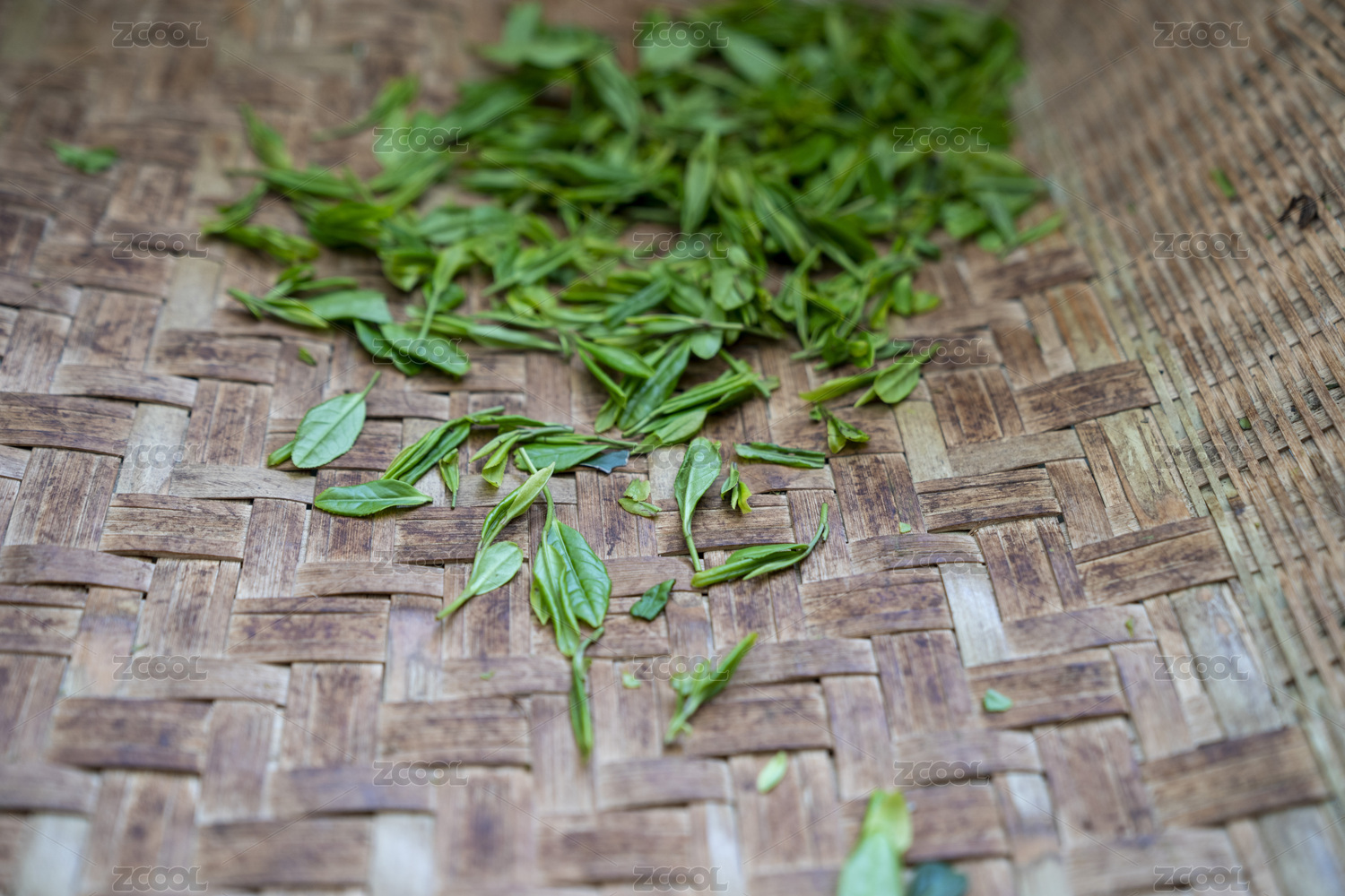春天被采摘下来的龙井茶叶正放在竹编制品上