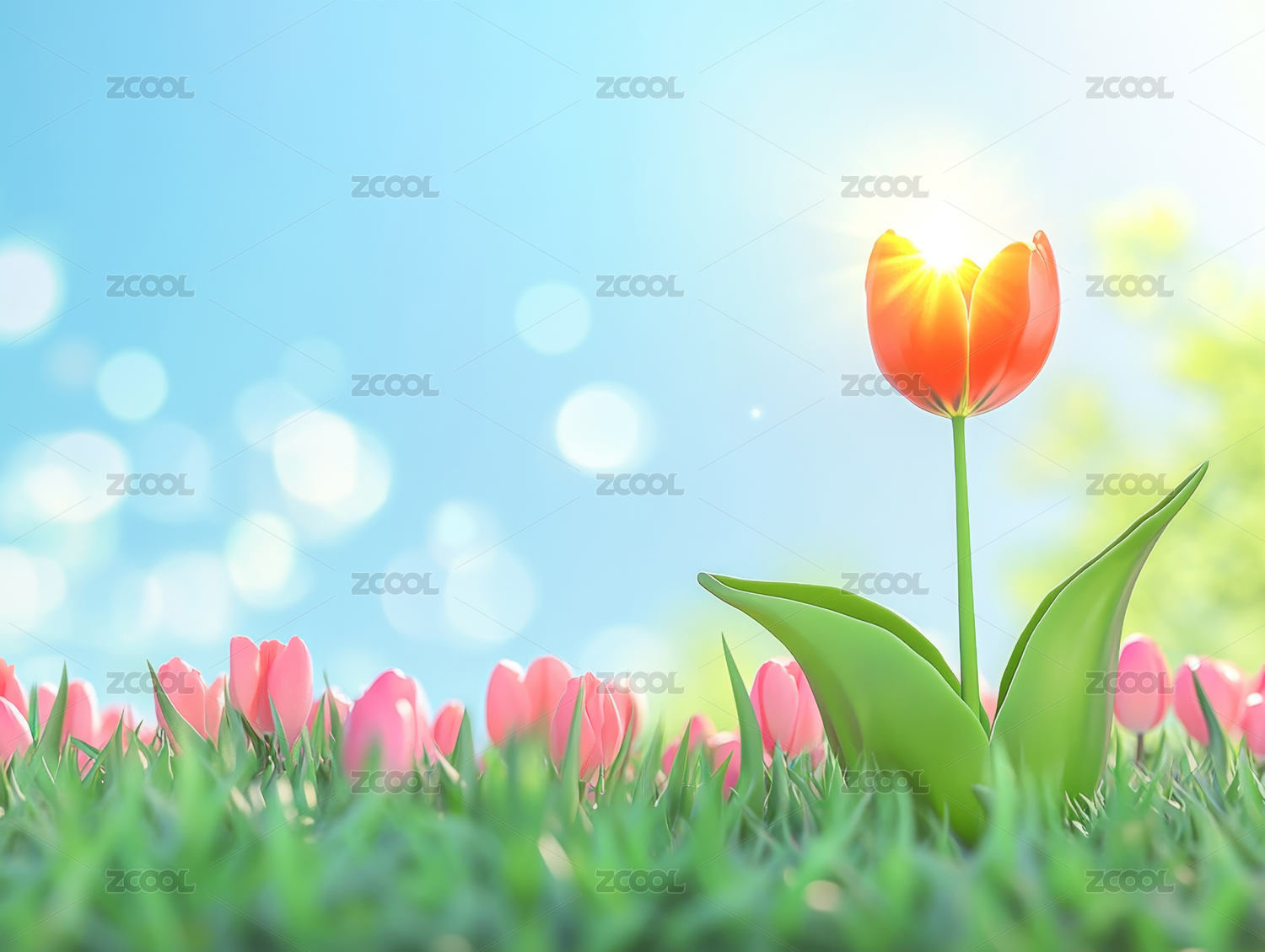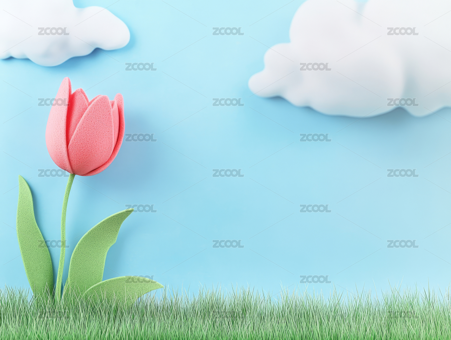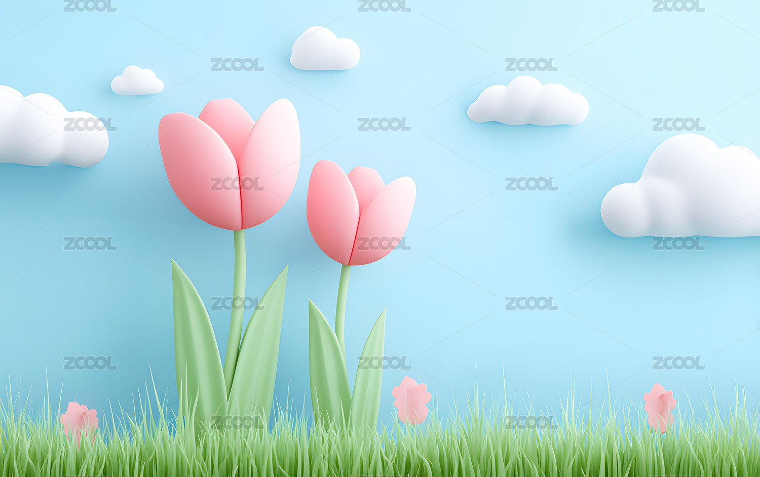 3D草地上郁金香蓝天白云