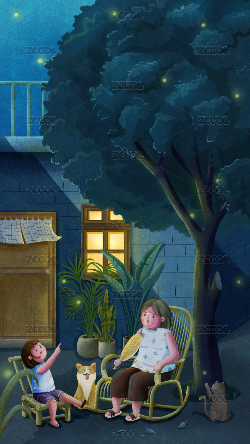 夏天的夜晚 奶奶和孙女在树下乘凉