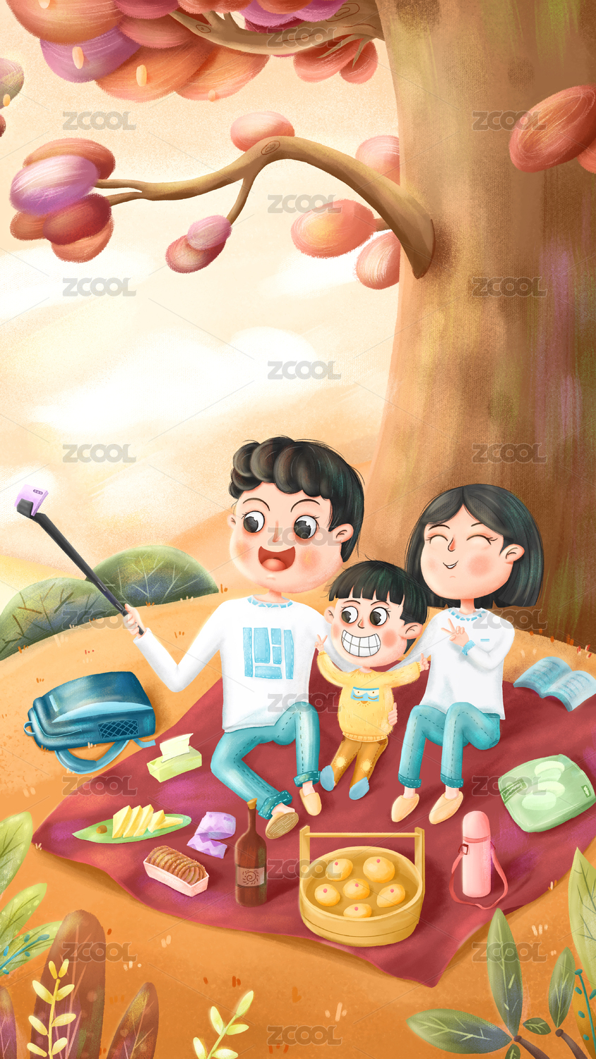 三胎家庭公园野餐儿童插画
