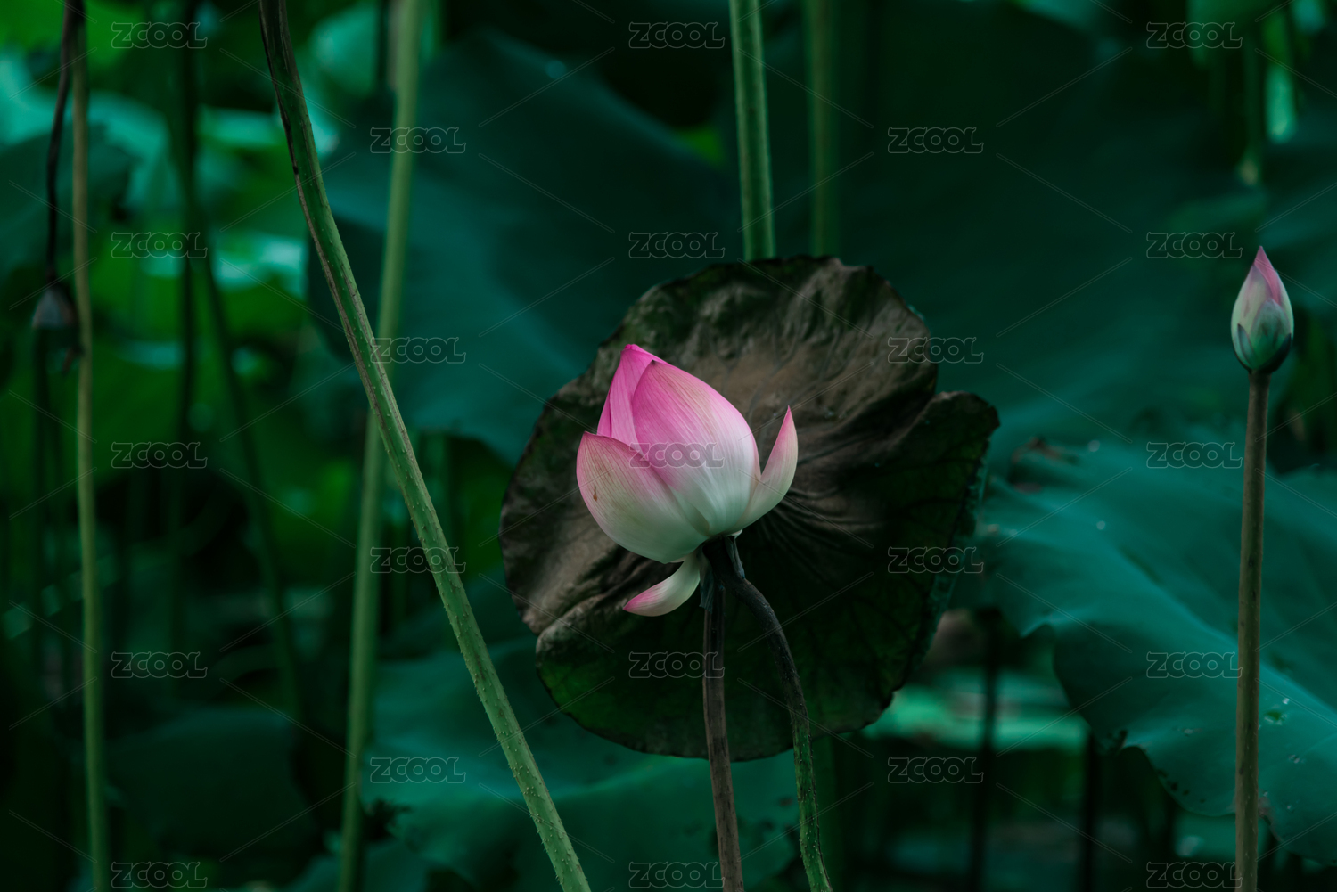 夏季青色荷叶中含苞待放的粉嫩荷花花朵