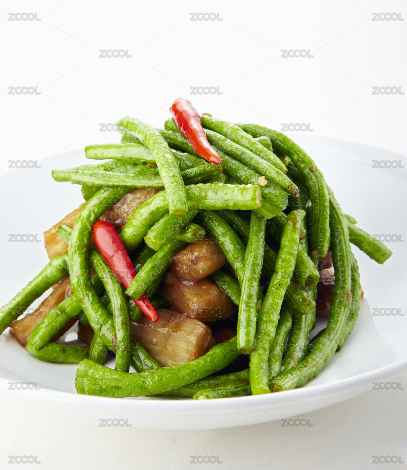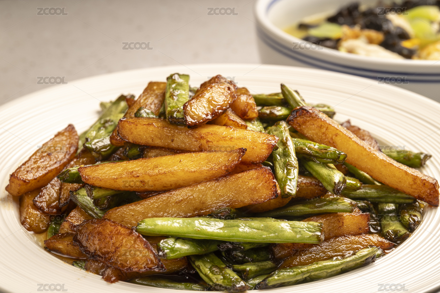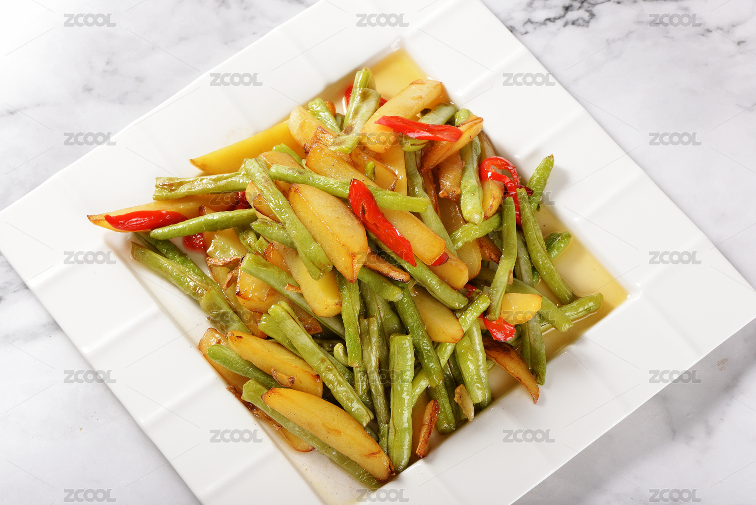 白盘里的干煸四季豆土豆条