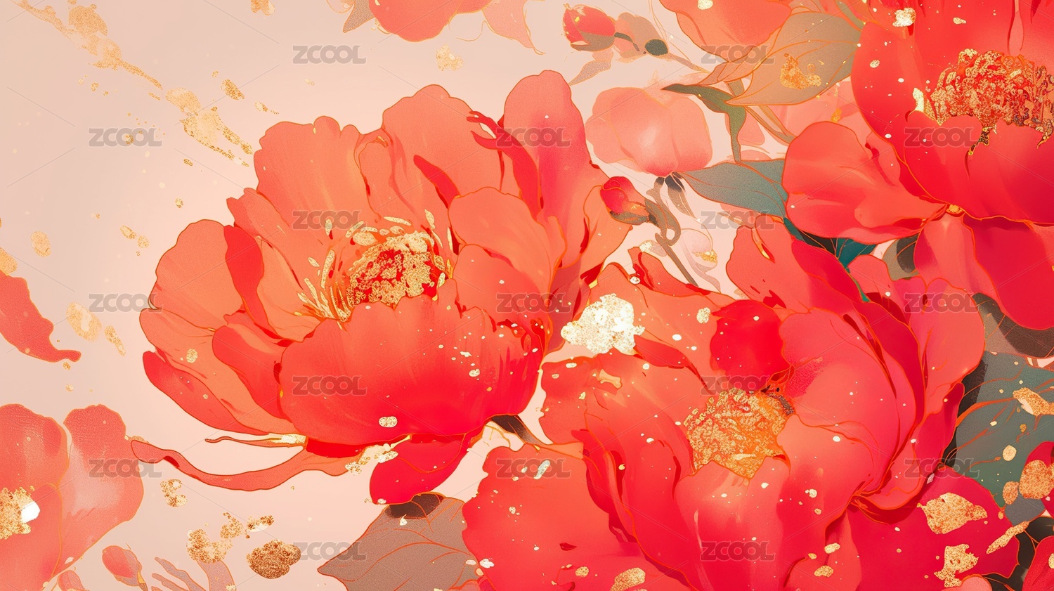 新中式水墨金箔岩彩牡丹花撞色水墨插画