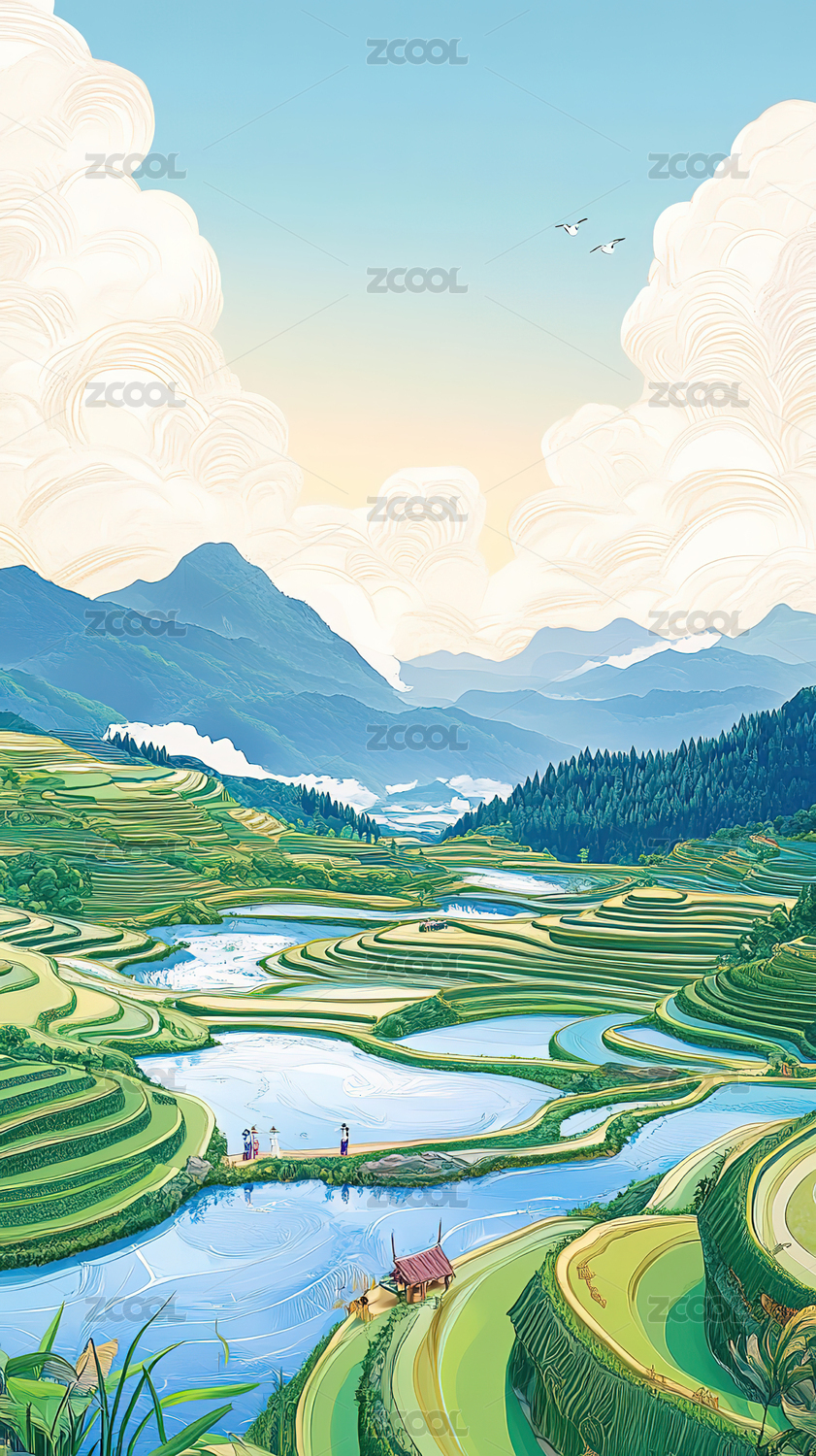 卡通风格的梯田山水风光