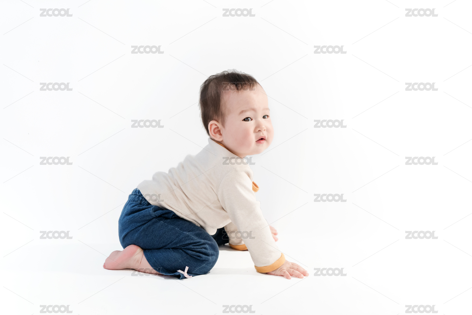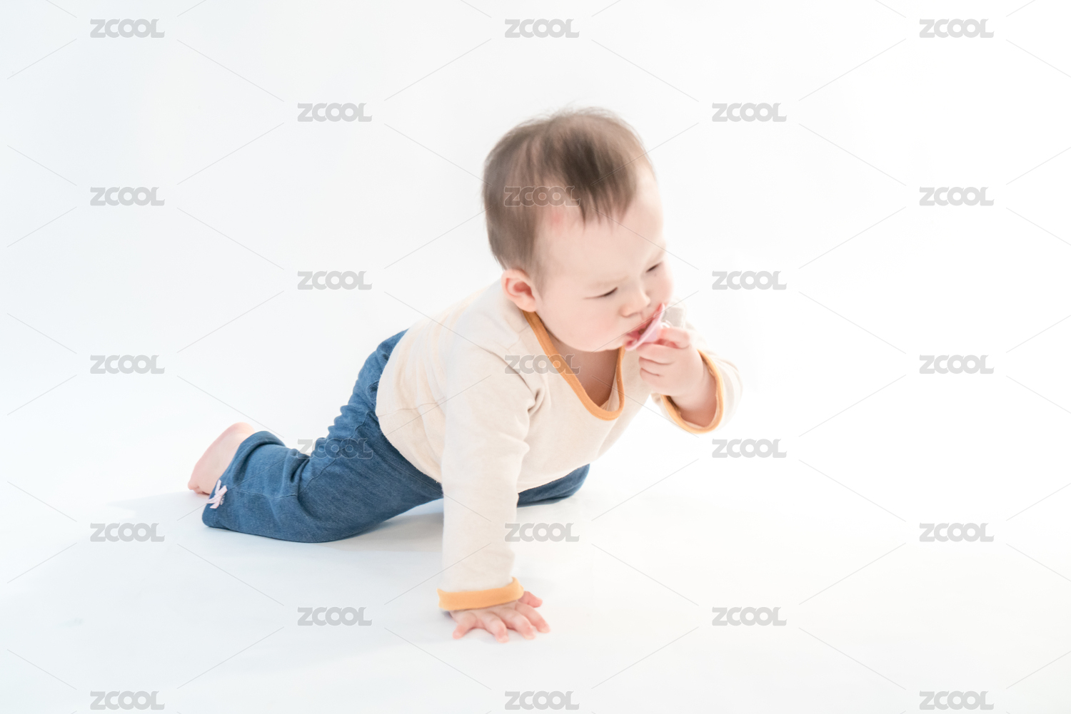 一百天大的宝宝一个人在纯白的背景里趴着玩
