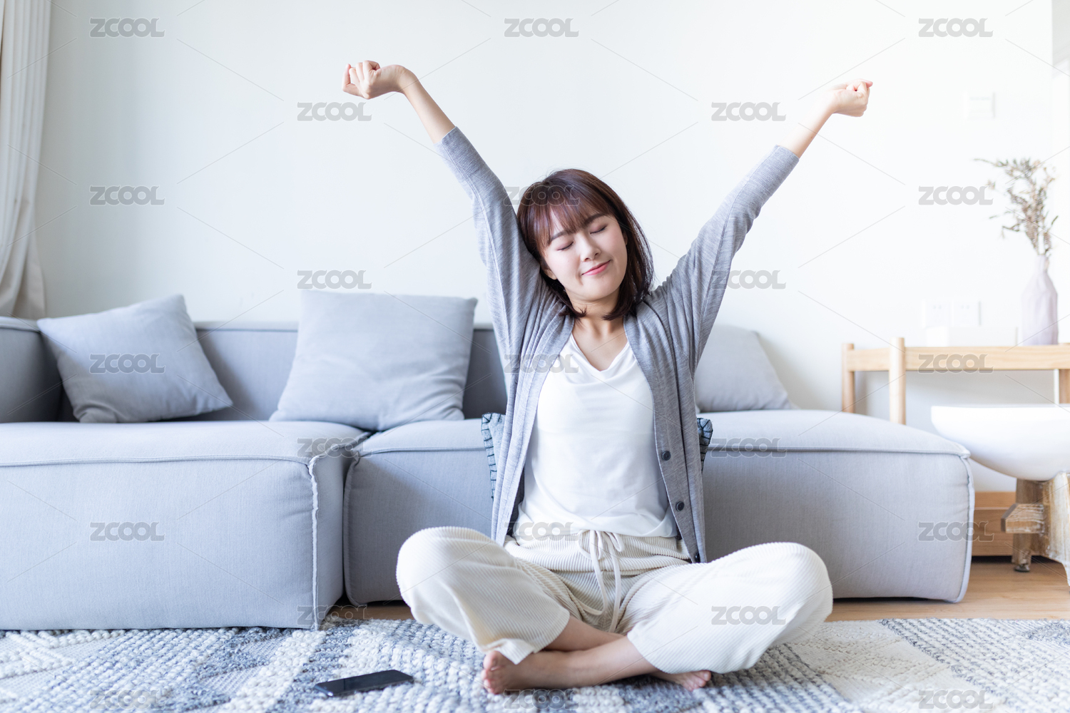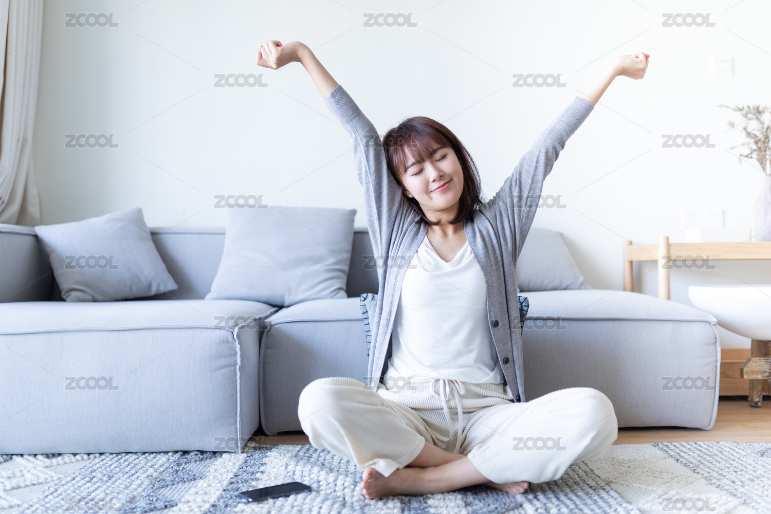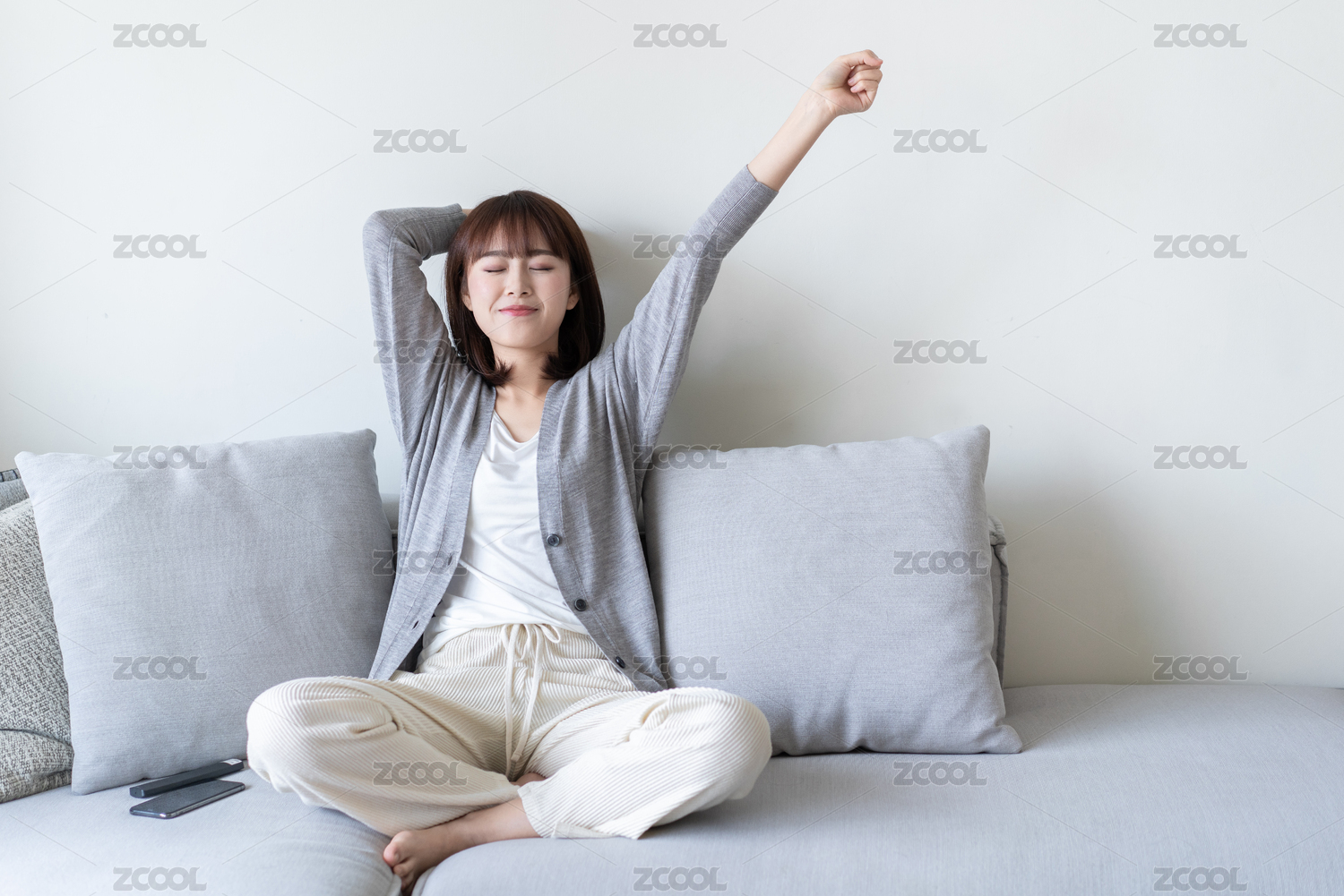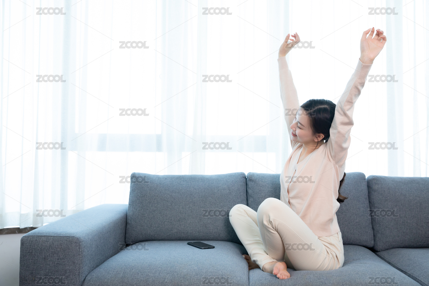 年轻女性盘腿坐在客厅沙发上伸懒腰