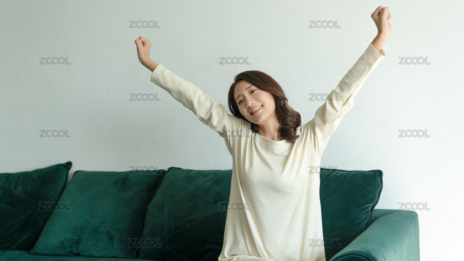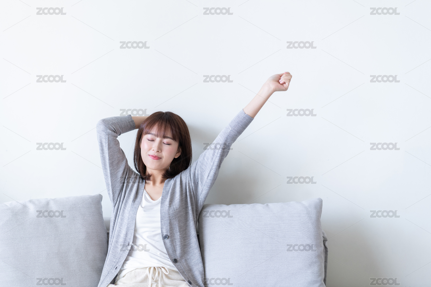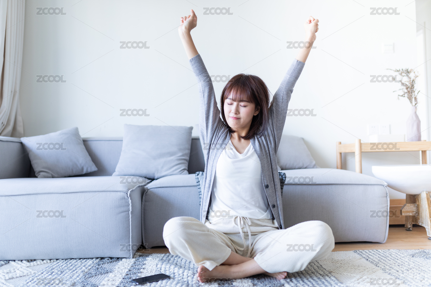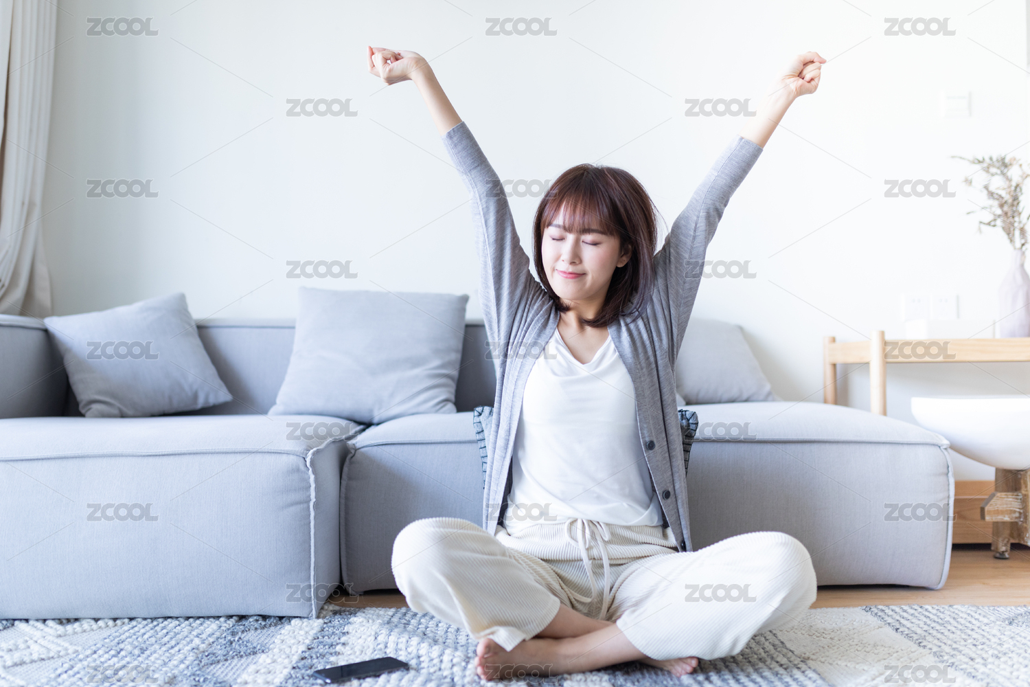 年轻女性盘腿坐在客厅沙发上伸懒腰