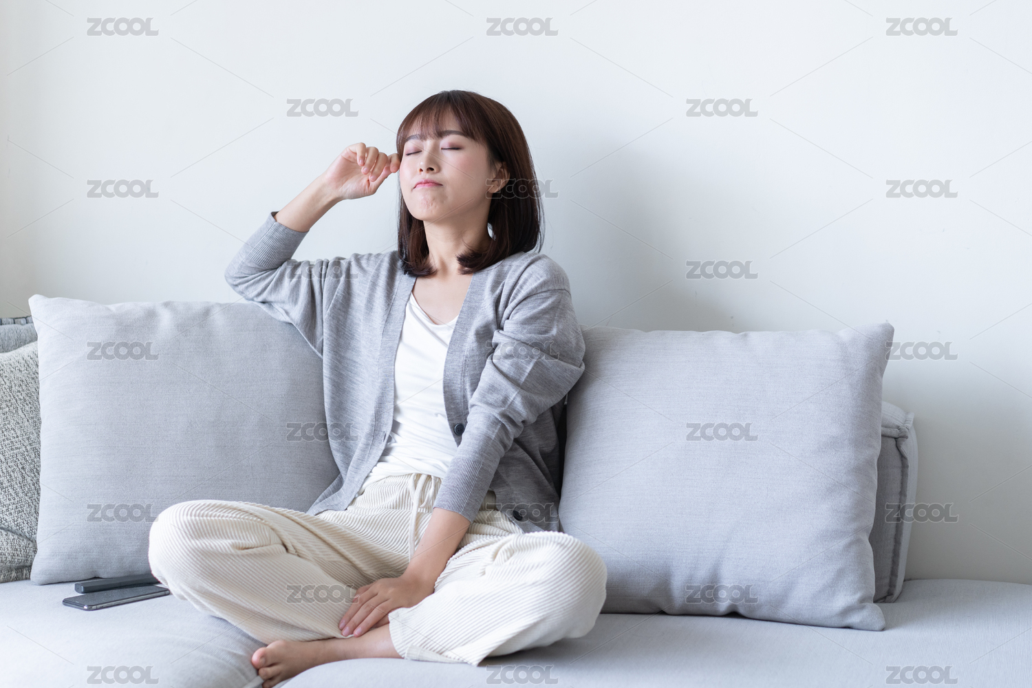 年轻女性坐在客厅沙发上靠着抱枕小憩