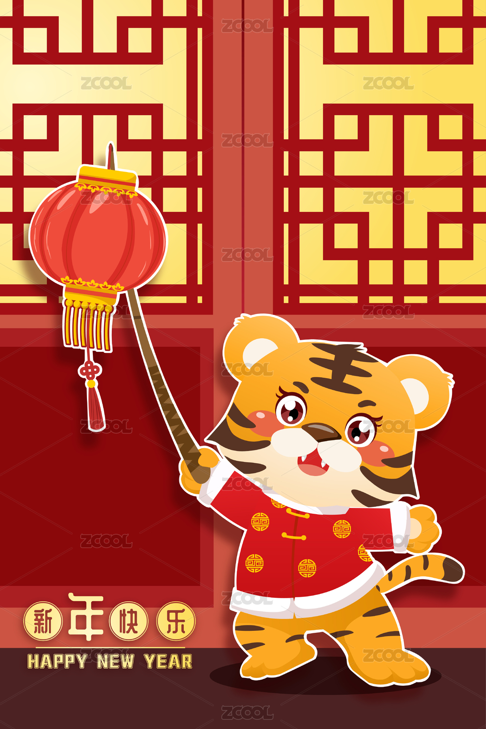 新年老虎挂灯笼插画矢量图