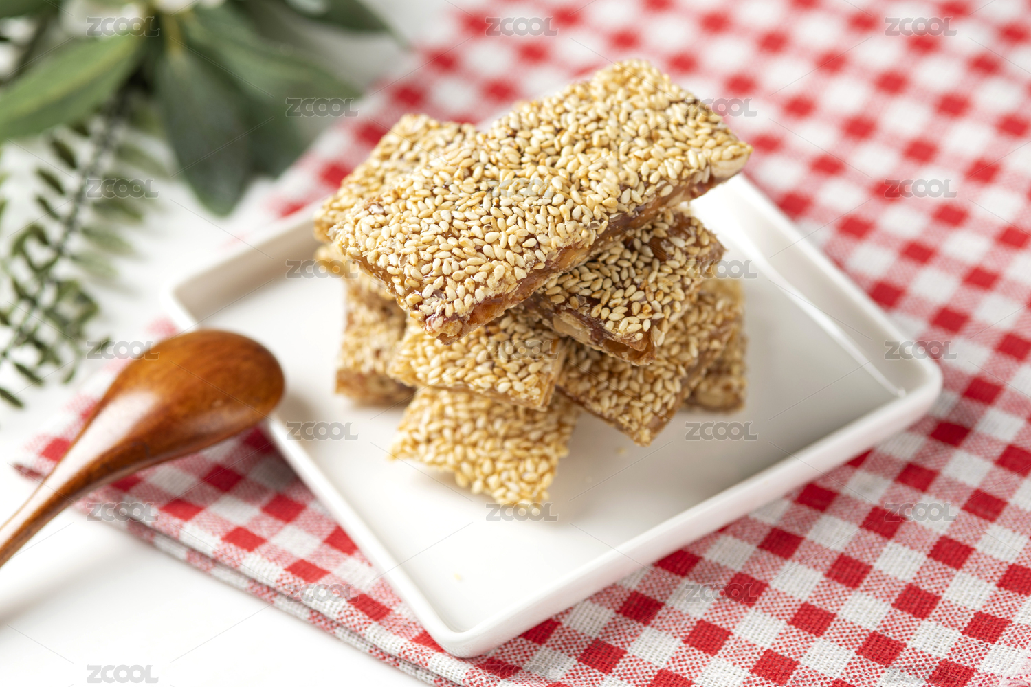 桌面上的盘子里的美味可口的芝麻牛皮糖
