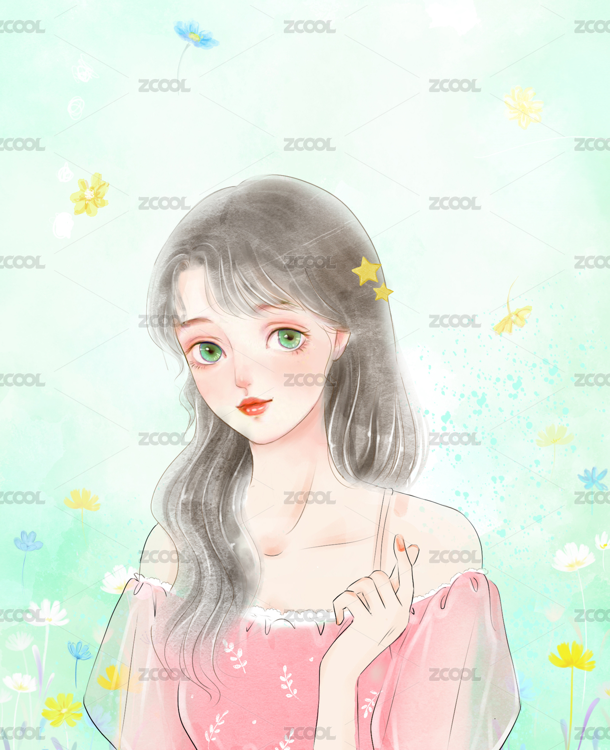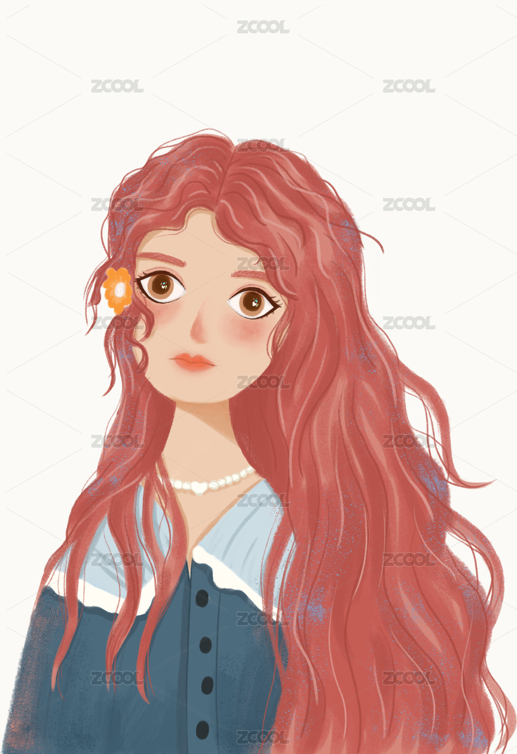 郁金香花朵蝴蝶结麻花辫温柔少女插画
