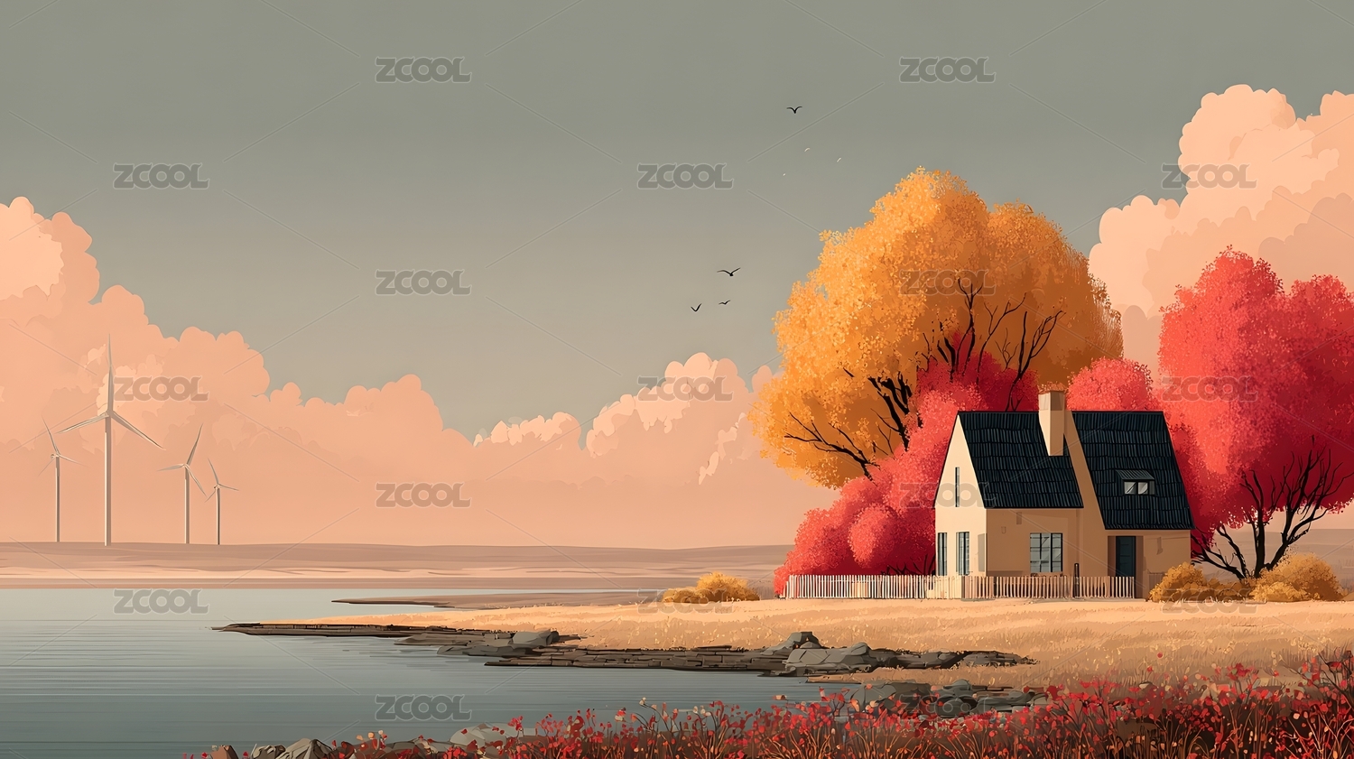 蓝天,宁静,乡村,田园,浪漫,秋季,风景,自然,金色,阳光