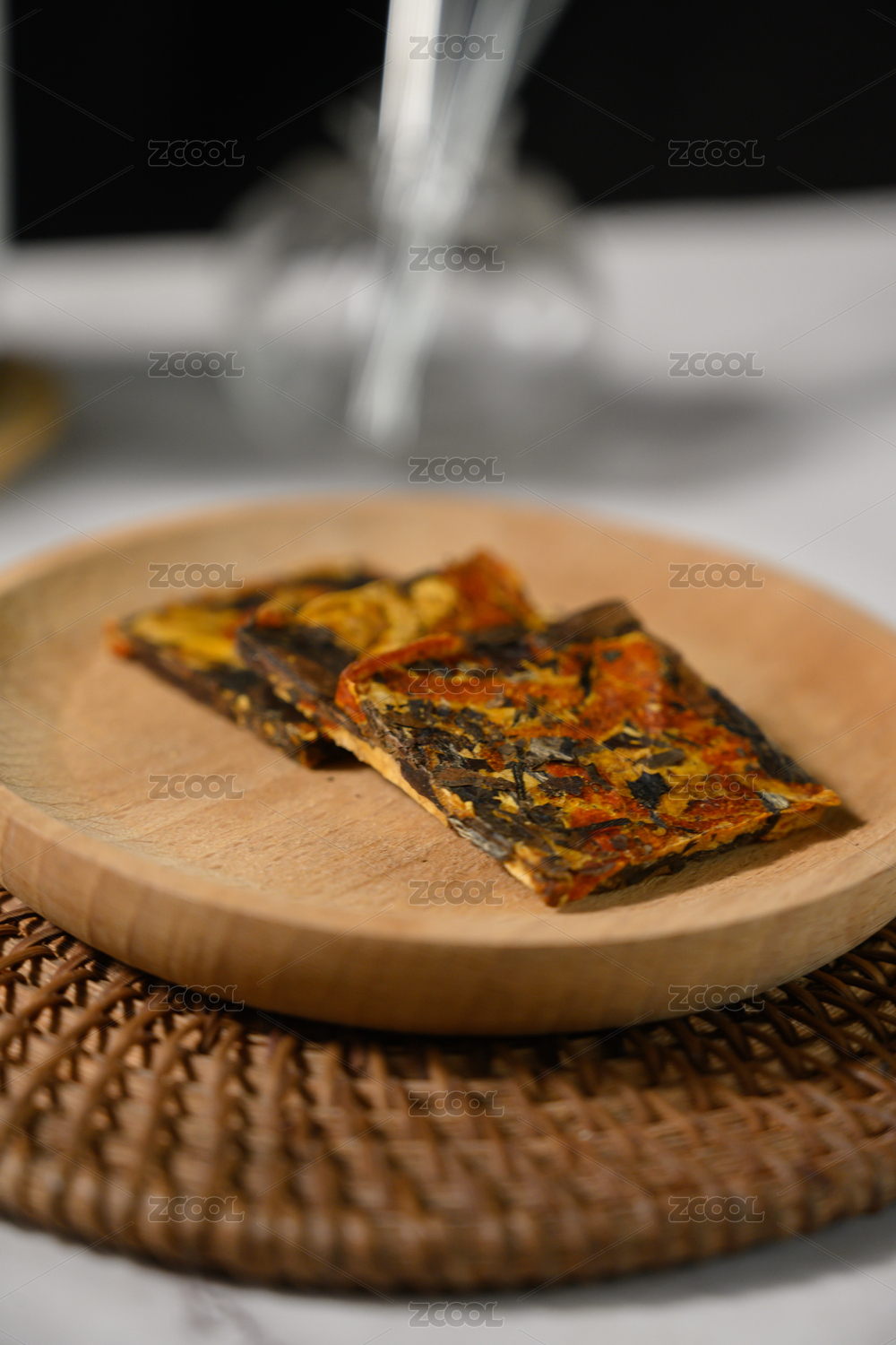 桌面上的盘子里的美味可口的陈皮白茶块