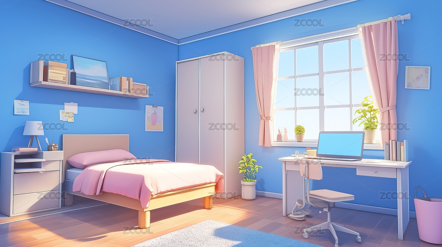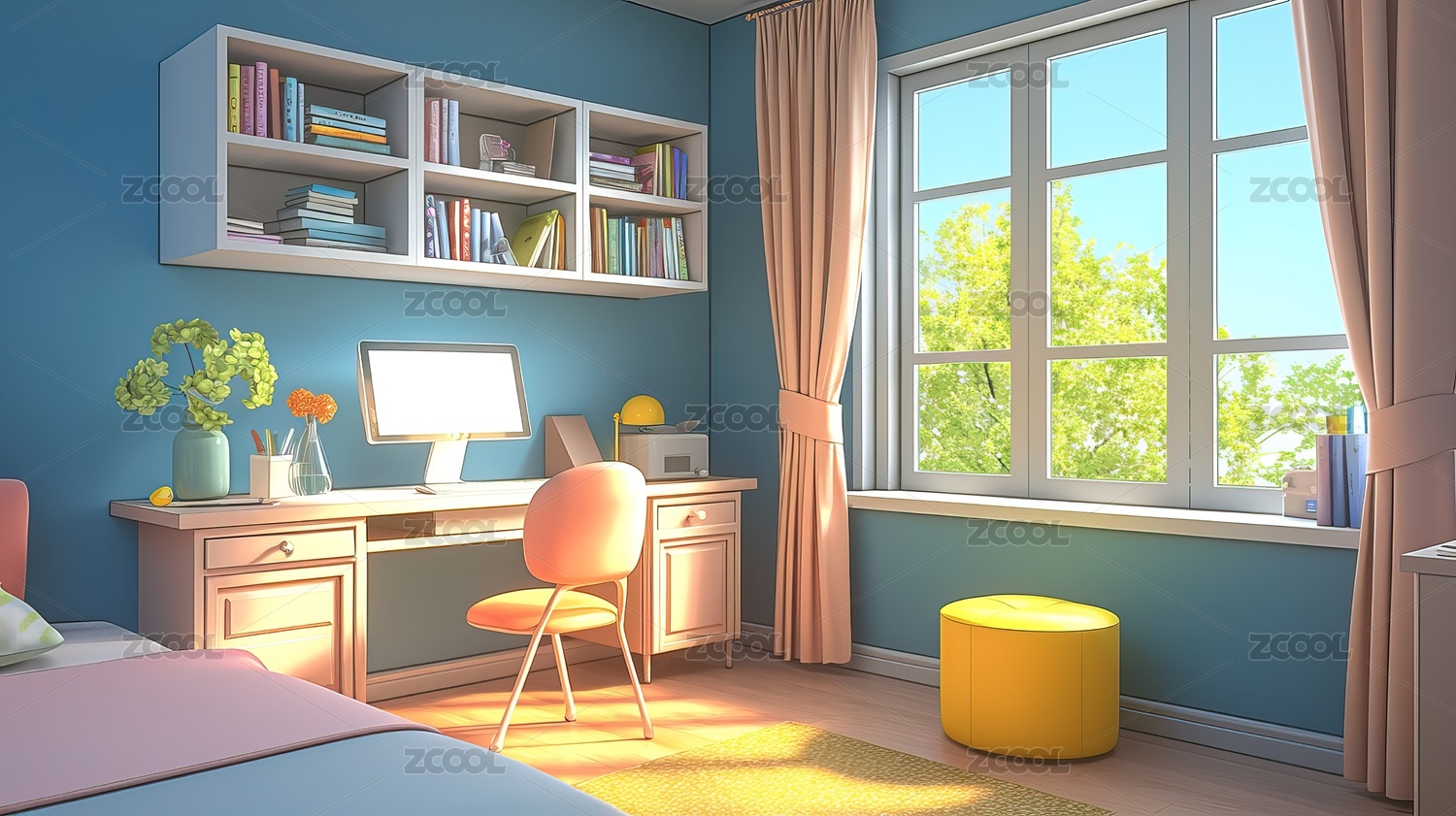 书桌,书架,卧室,温馨,整洁,电脑,窗户,植物,装饰,居家生活