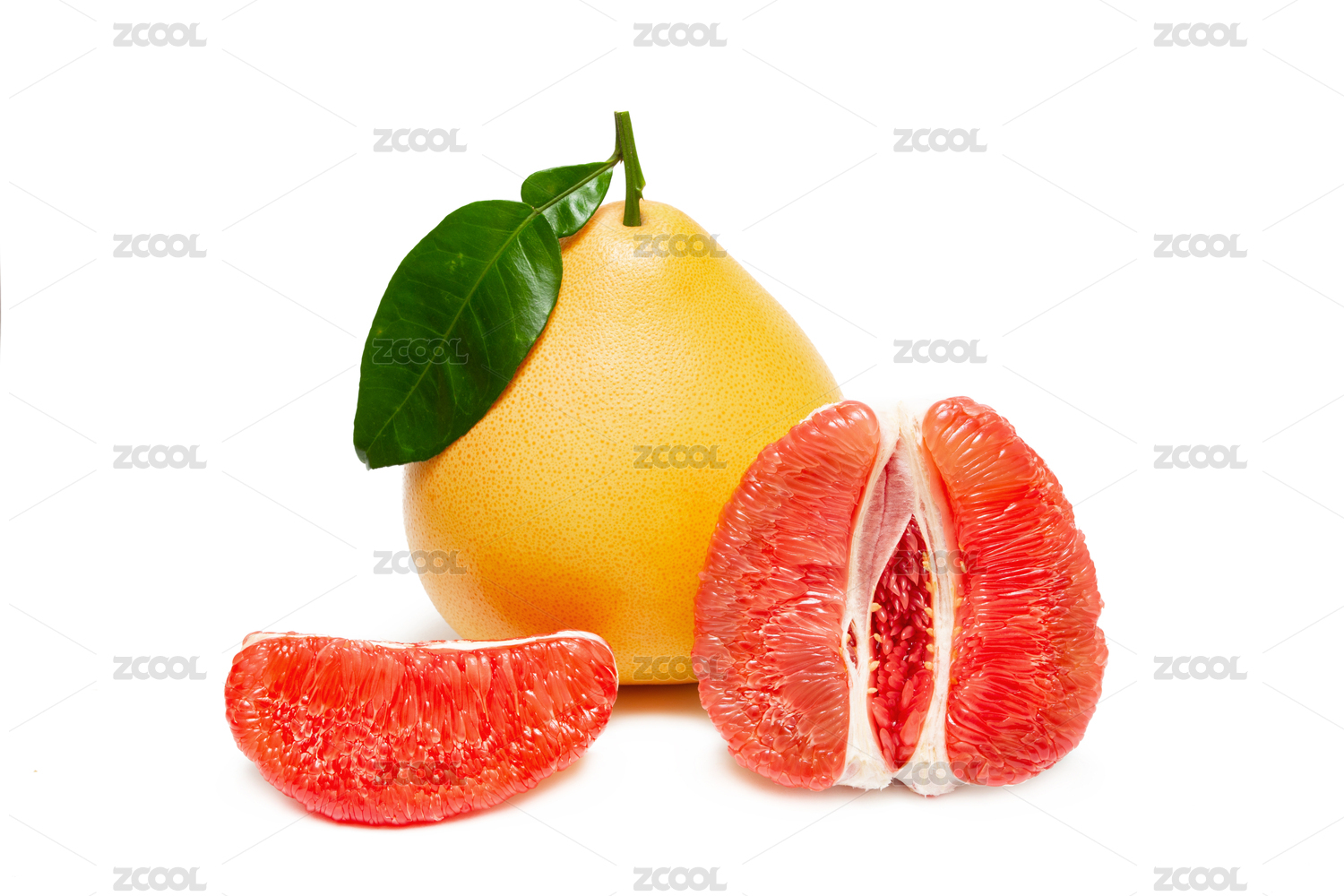 白底上有一个完整的青皮红心柚和红心柚果肉