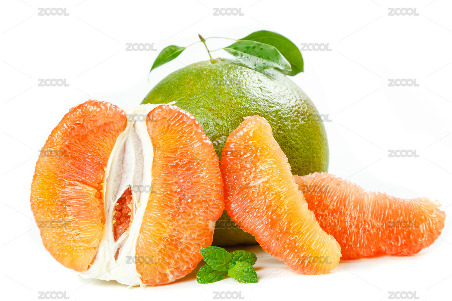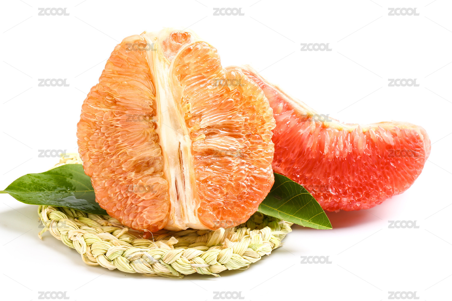白底上放着一个削开半节皮柚子和黄金柚果肉