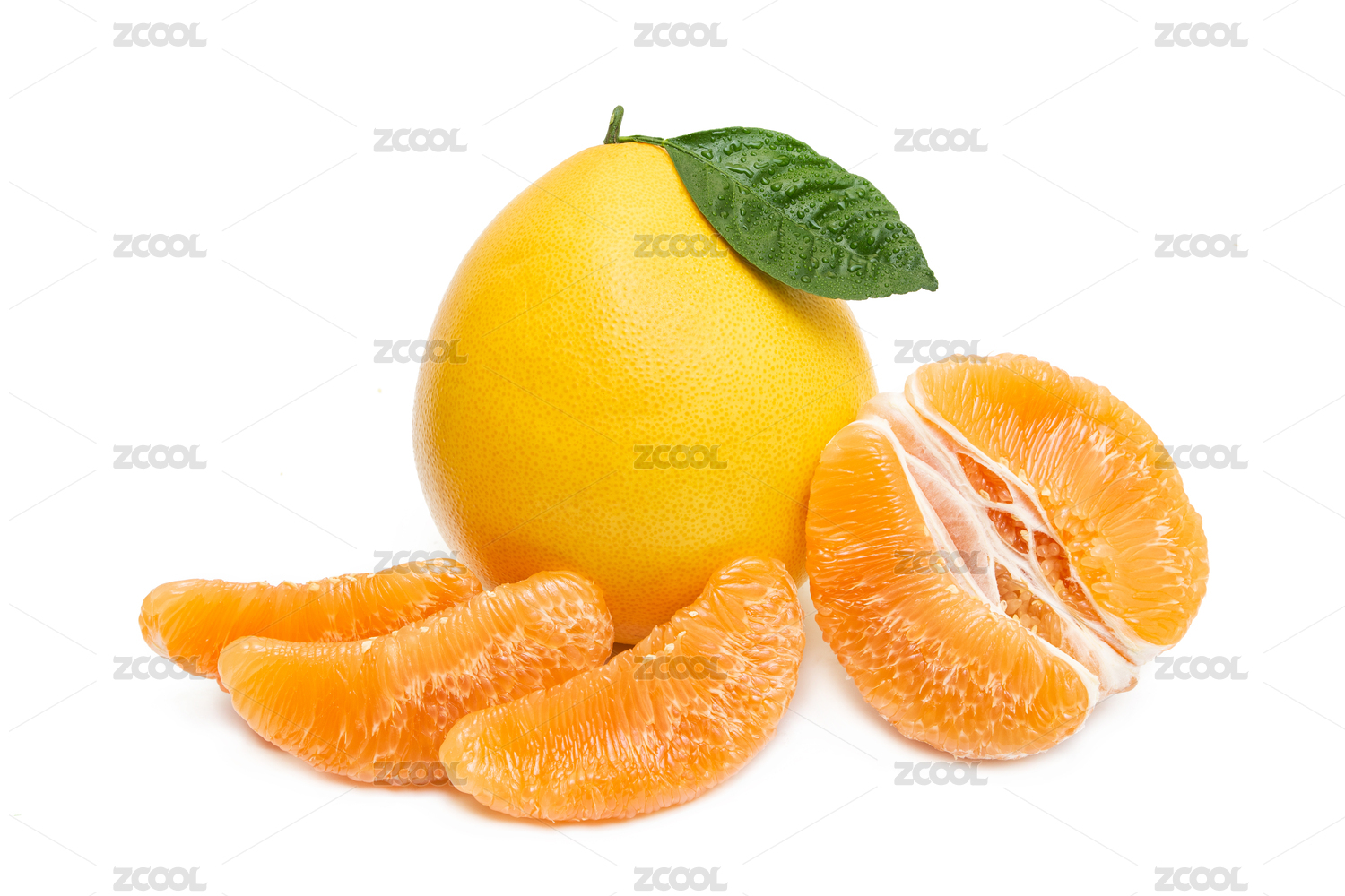 白底上放着一个黄金柚和剥皮的黄肉蜜柚