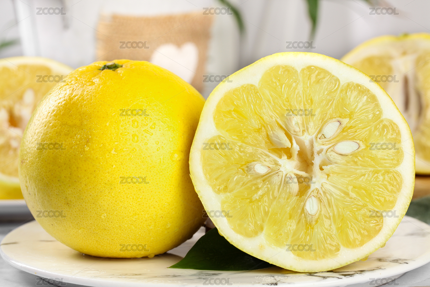 白石盘里放着一个完整的葡萄柚和半边葡萄柚