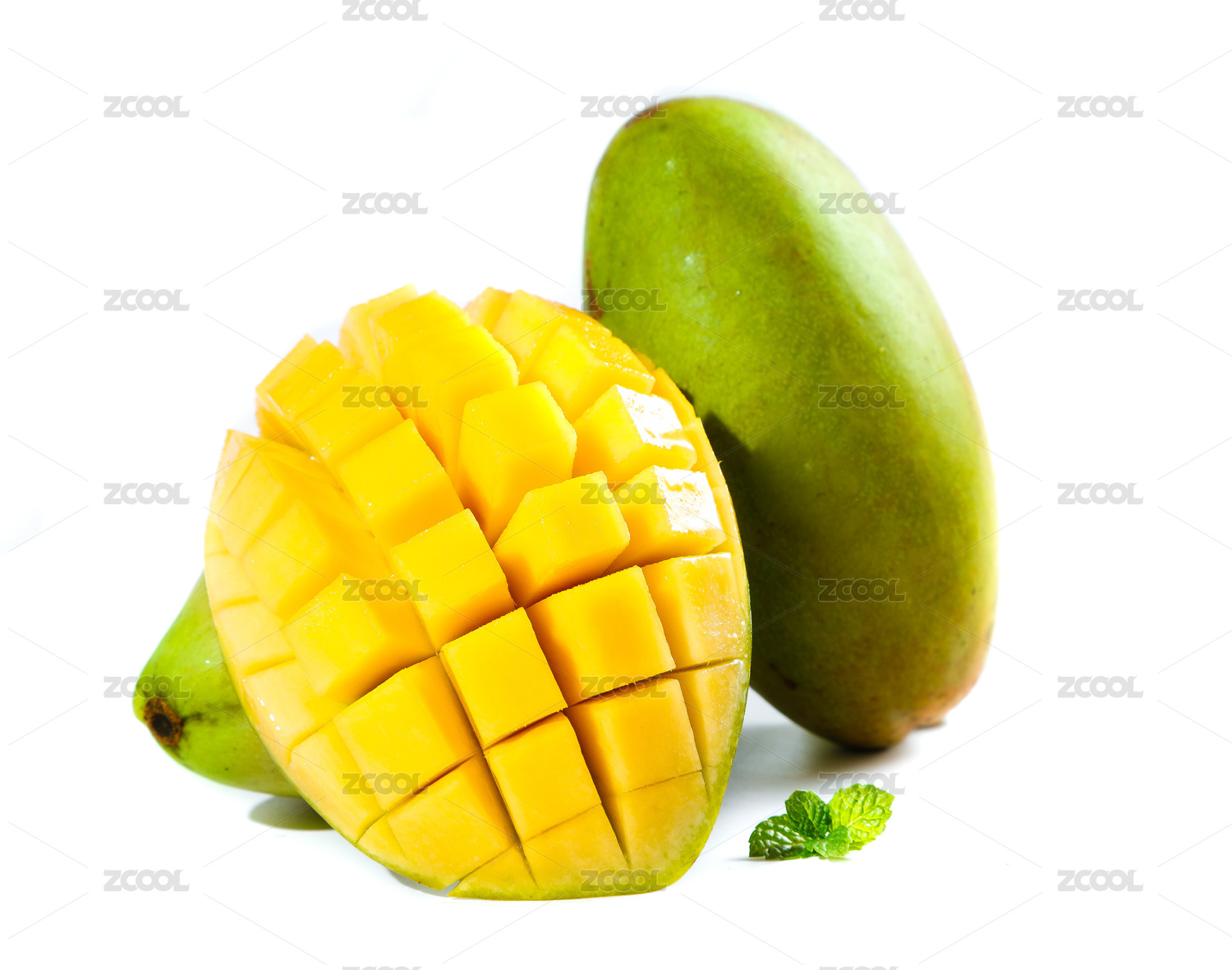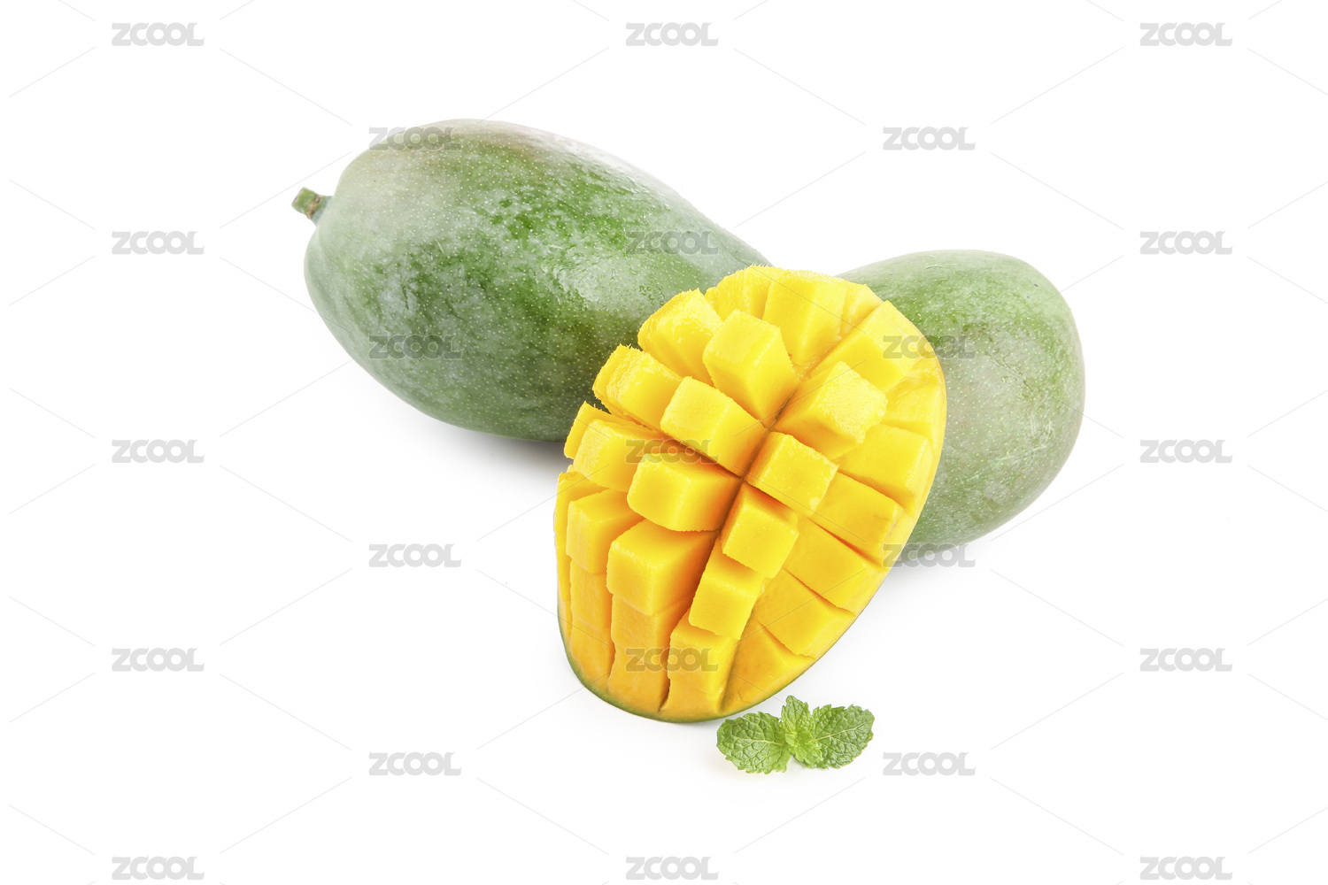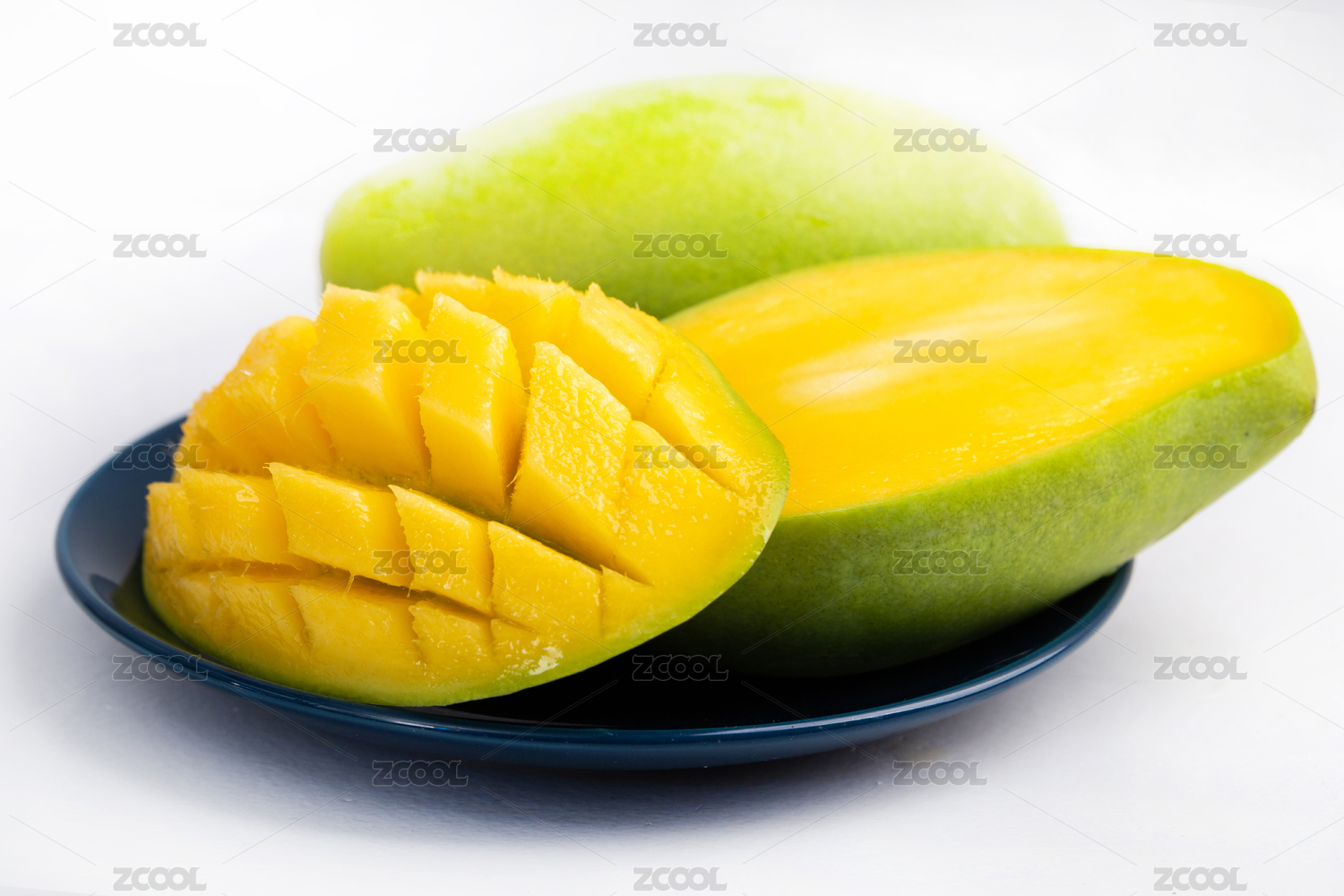 白底上放着一堆新鲜玉芒果和切开的芒果