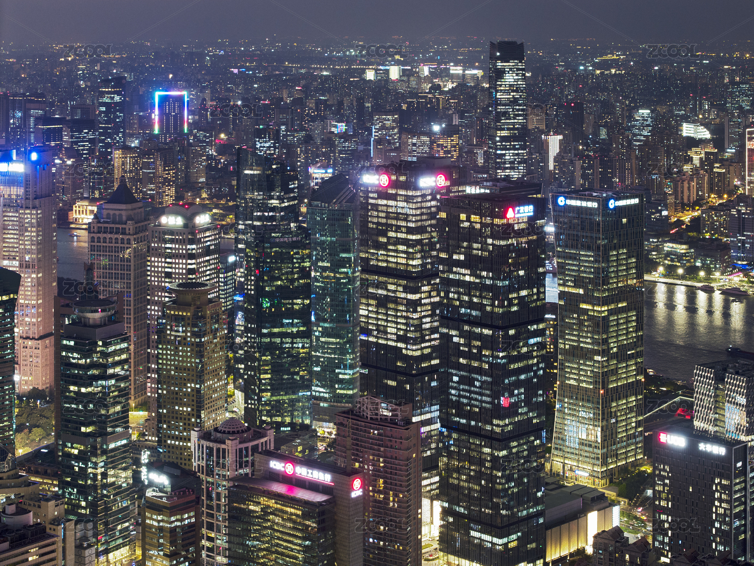 俯瞰航拍中国上海浦东陆家嘴CBD建筑夜景