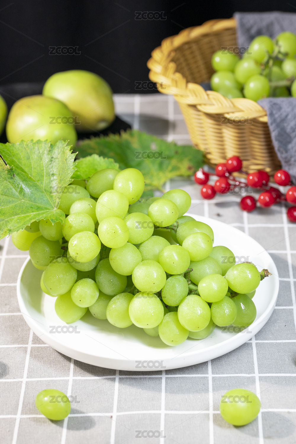 桌子上盘子装的新鲜阳光玫瑰葡萄