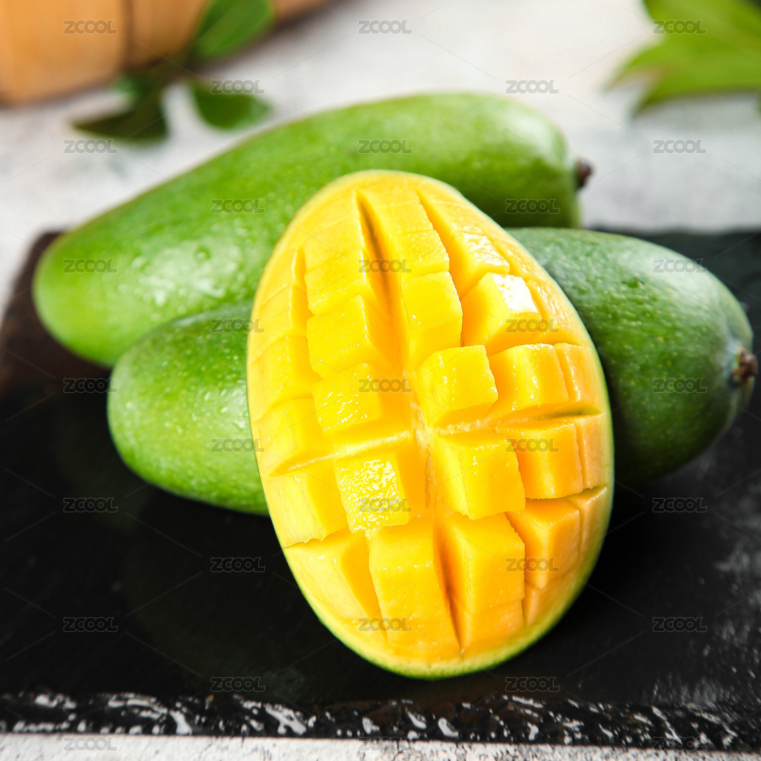 白底上放着一堆新鲜玉芒果和切开的芒果