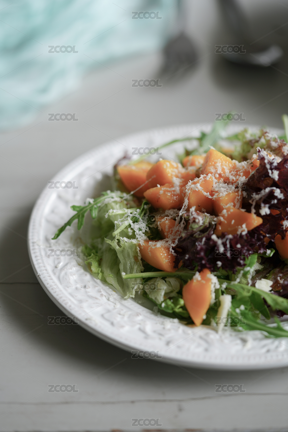 简易背景下放在白色餐盘内的蔬菜水果沙拉