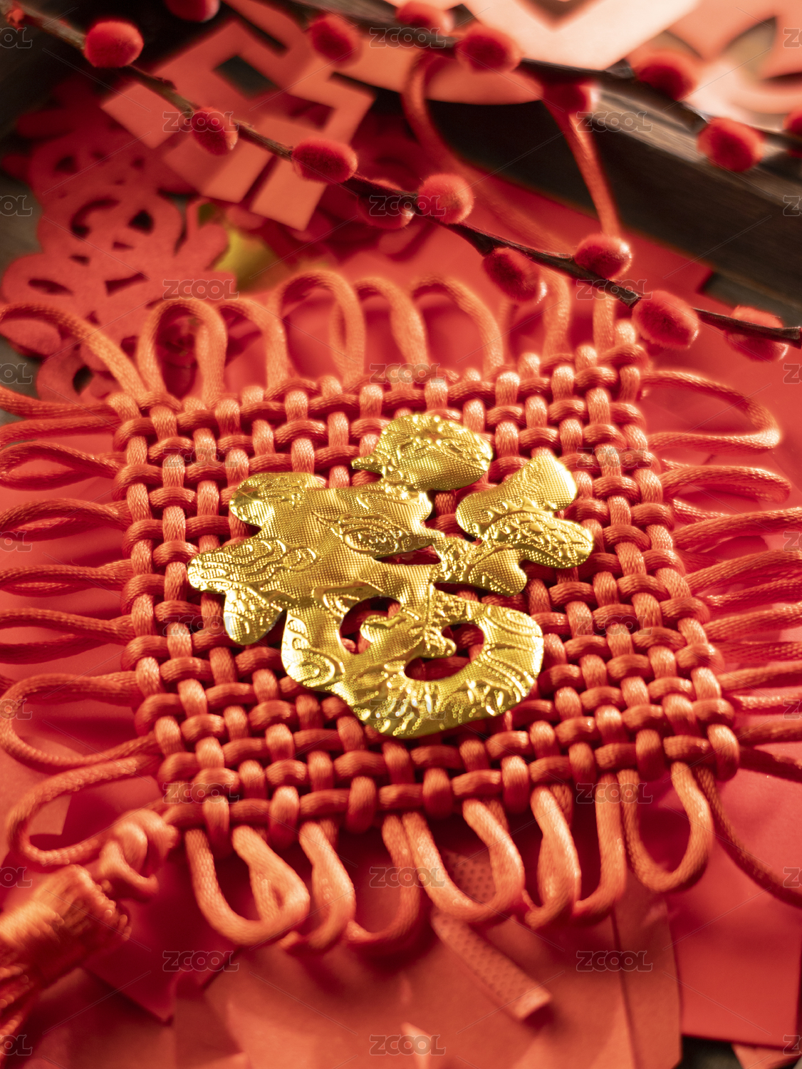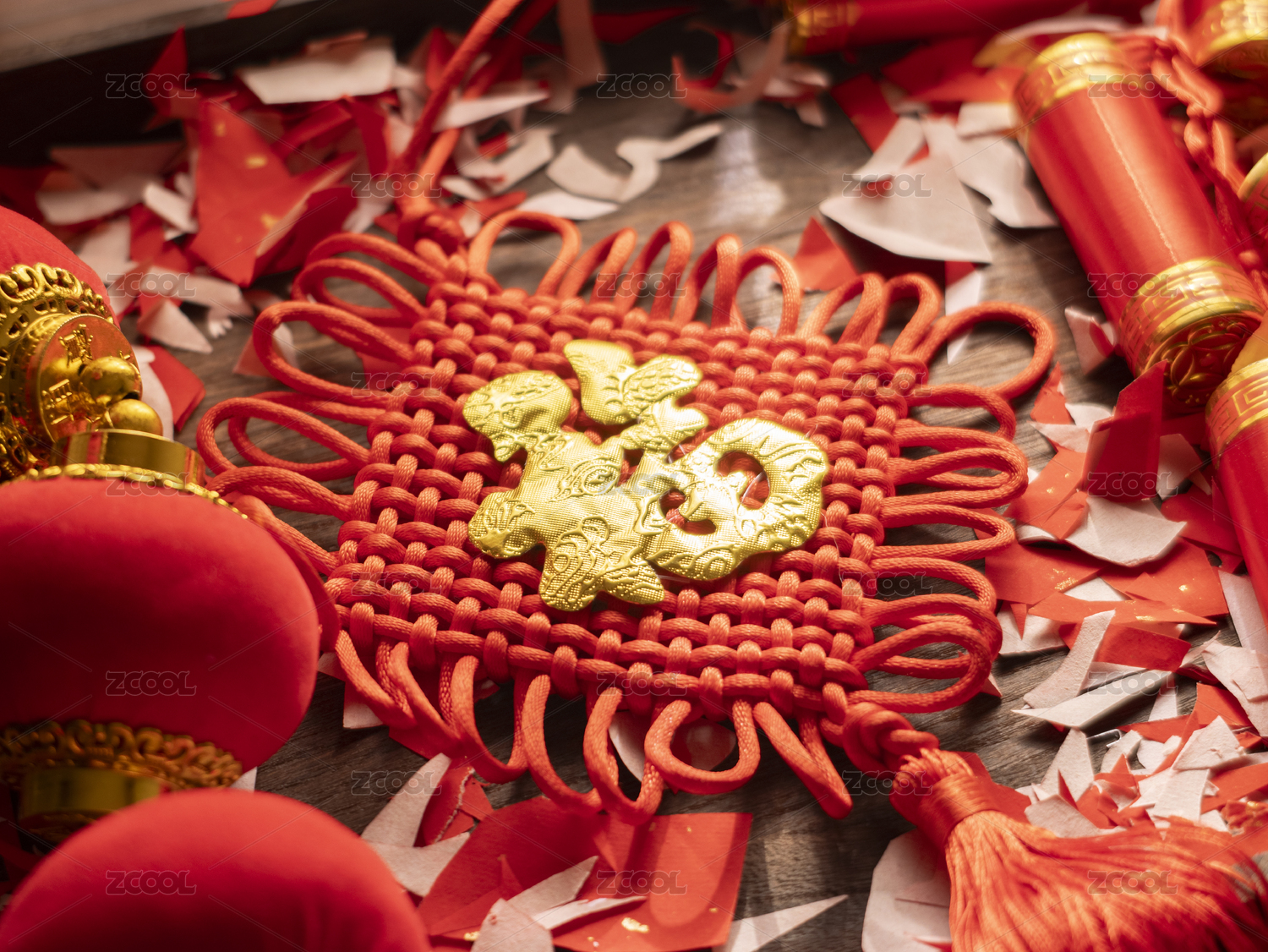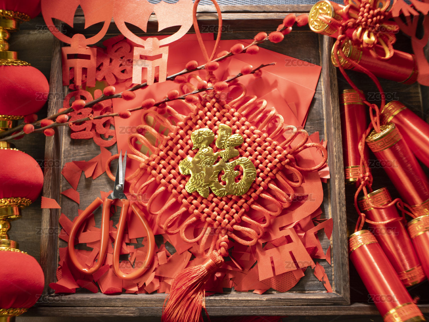 俯视桌子上的中国结和红包及算盘和小灯笼