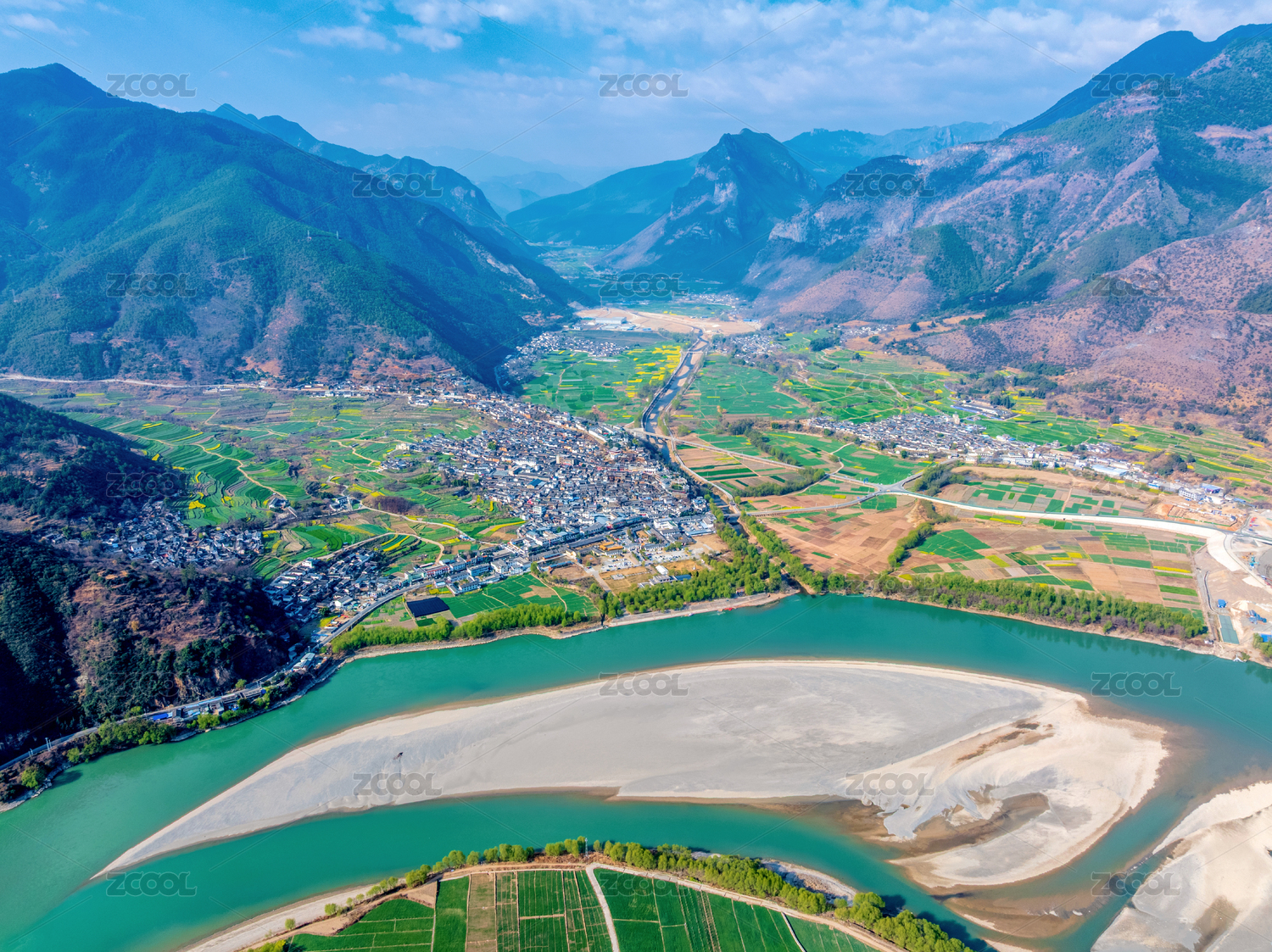 航拍中国云南丽江石鼓镇段清澈的金沙江