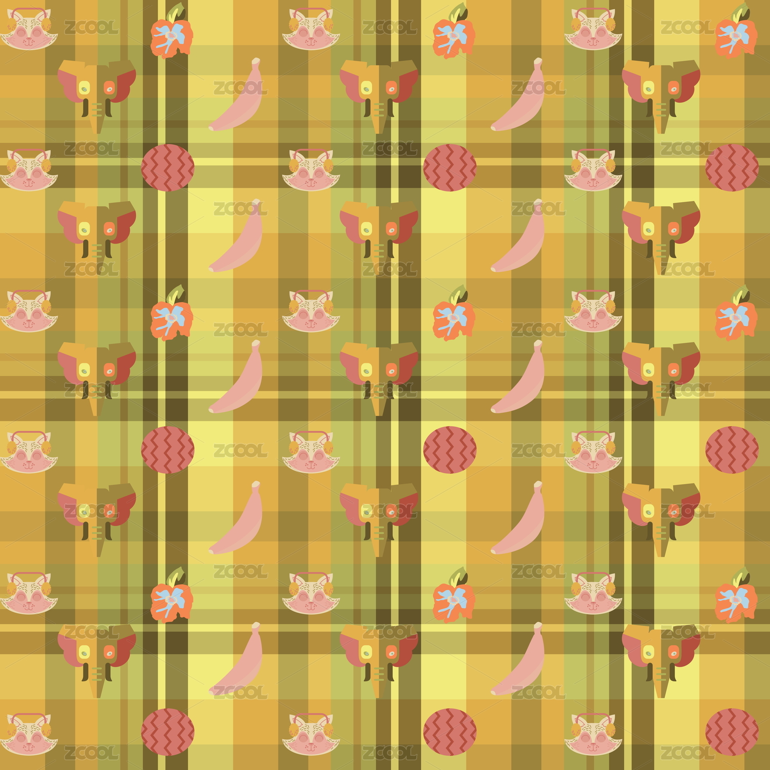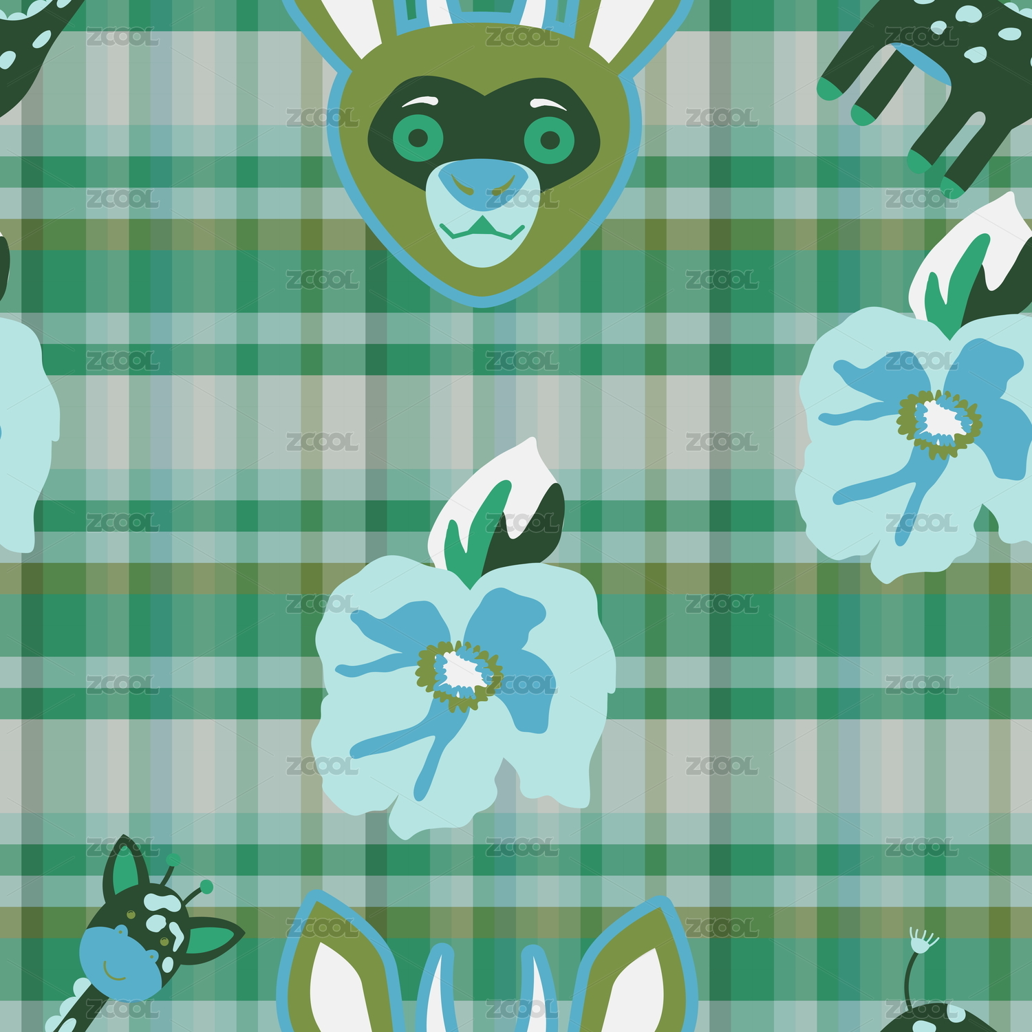 创意卡通动物植物叠加格纹印花