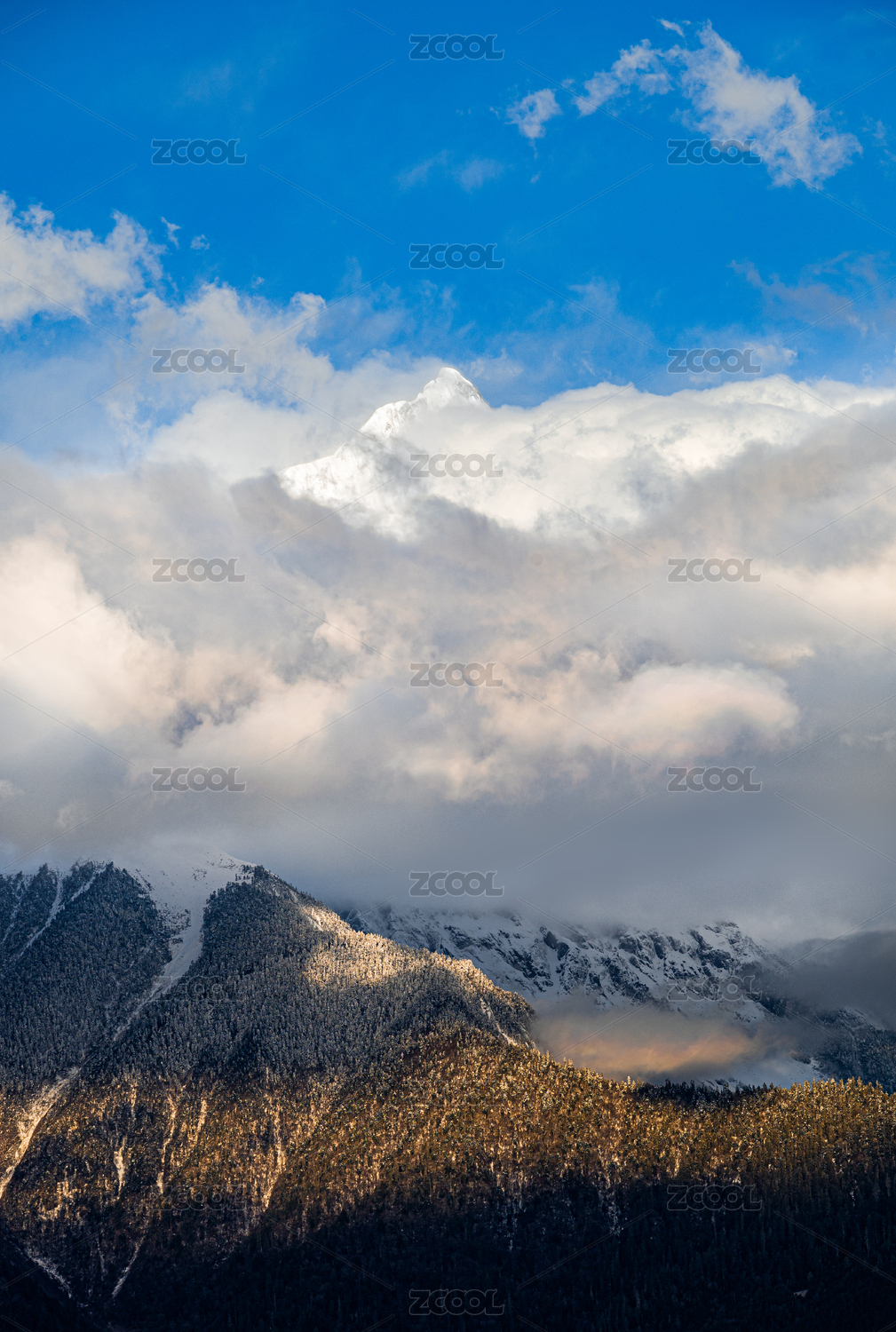 晴空多云笼罩的梅里雪山卡瓦格博峰顶及山坡