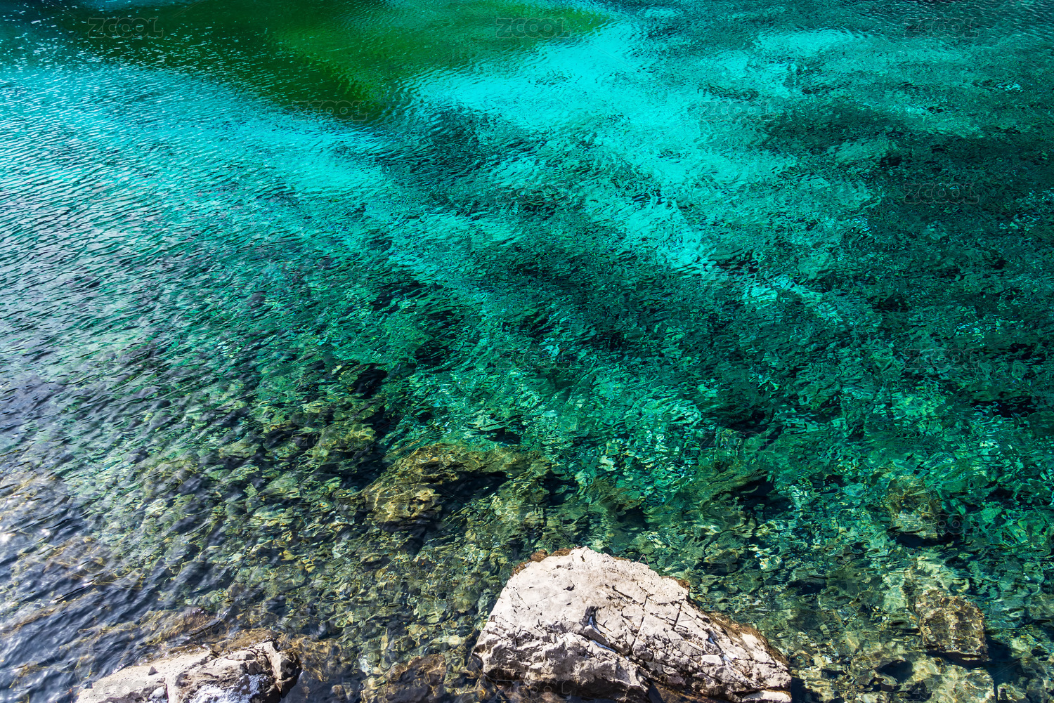 四川省阿坝州九寨沟-湖边岩石的高角度视图