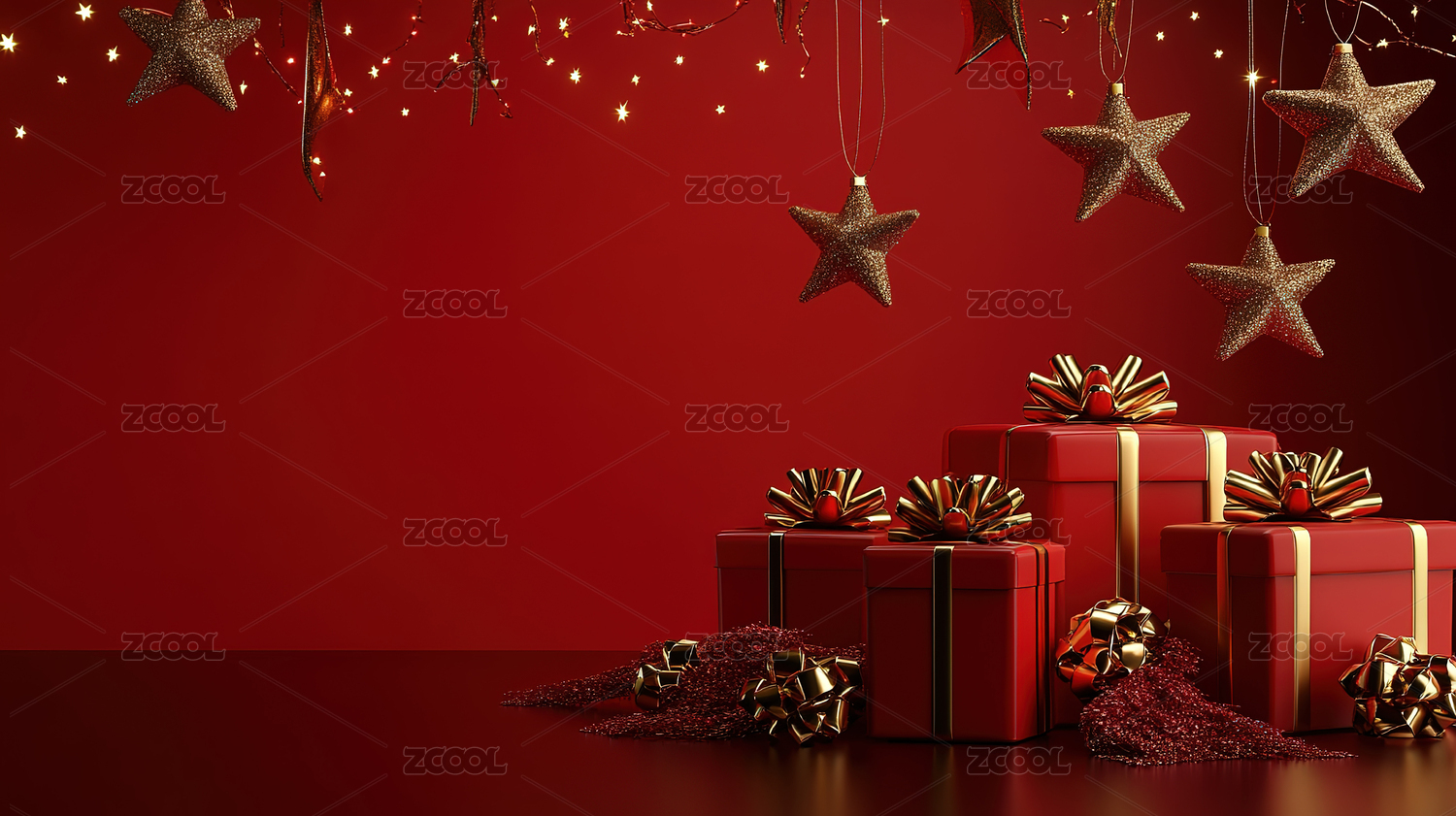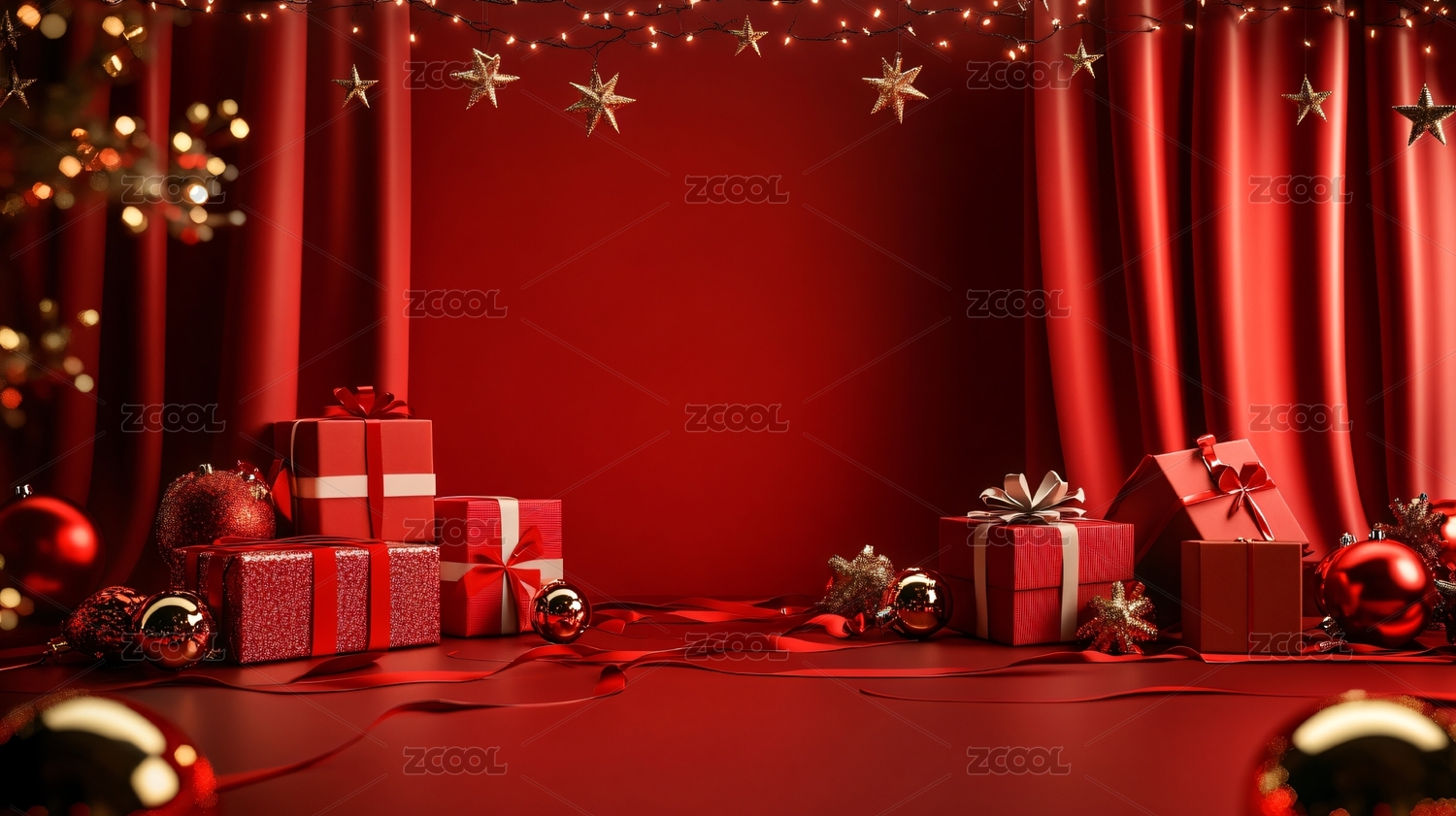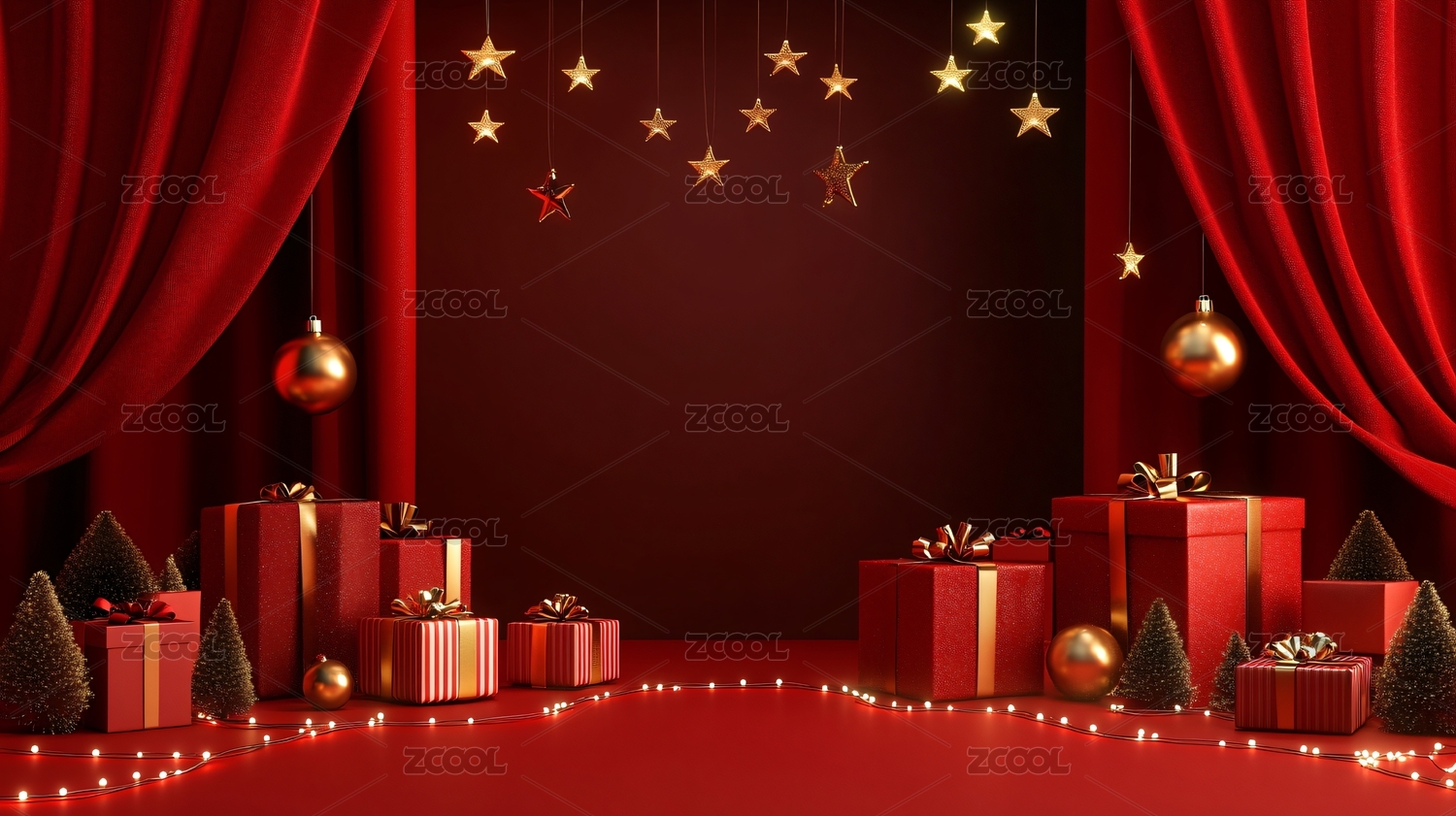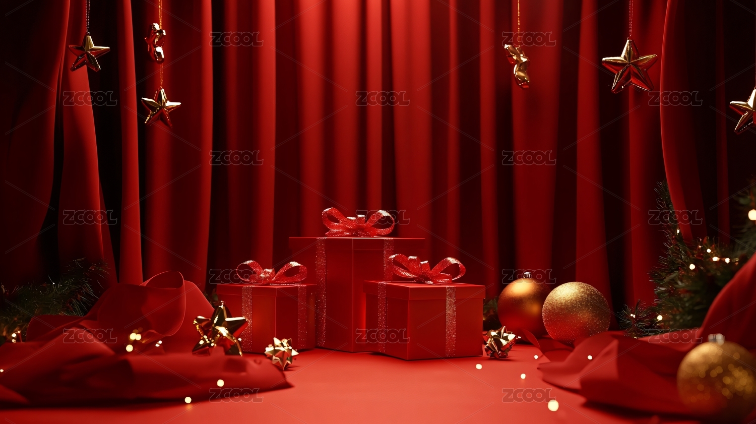 红色和金色主题,简约构图,红色幕布,圣诞树,礼品盒,星星装饰,展台,圣诞树展台