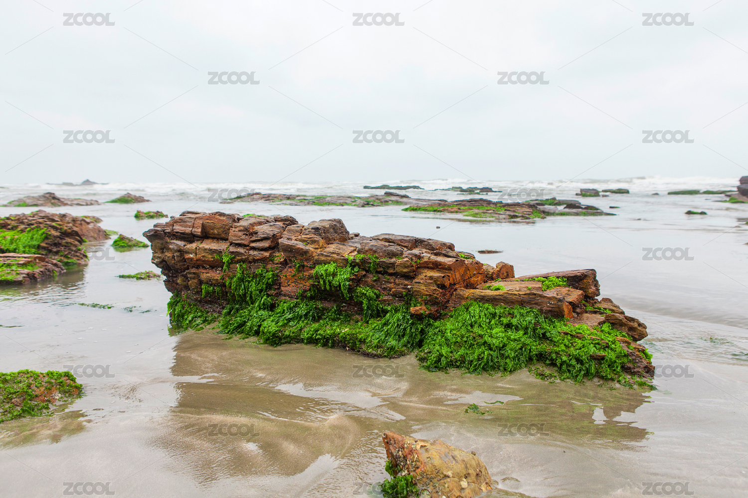 中国海南沙井沙滩海浪与长满青苔的岩石