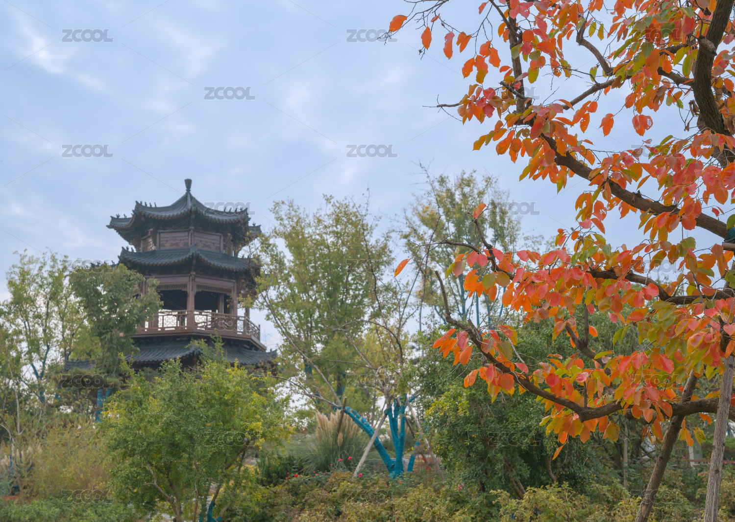 河南南阳卧龙岗文化园景区来风阁秋色全景
