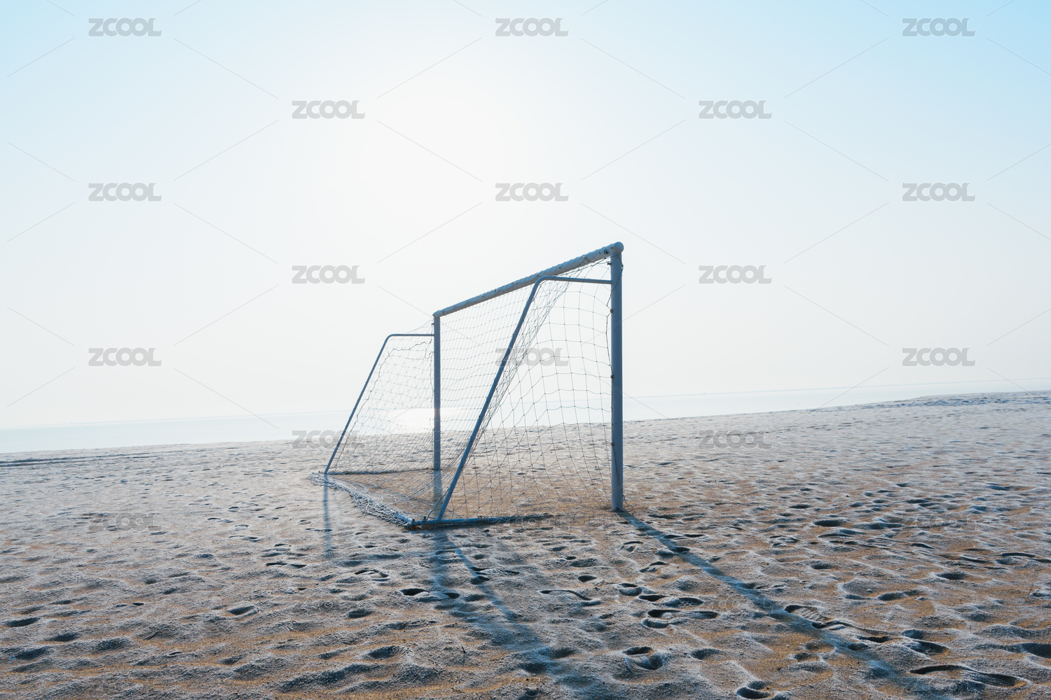 冬天早晨海边上的沙滩足球球门