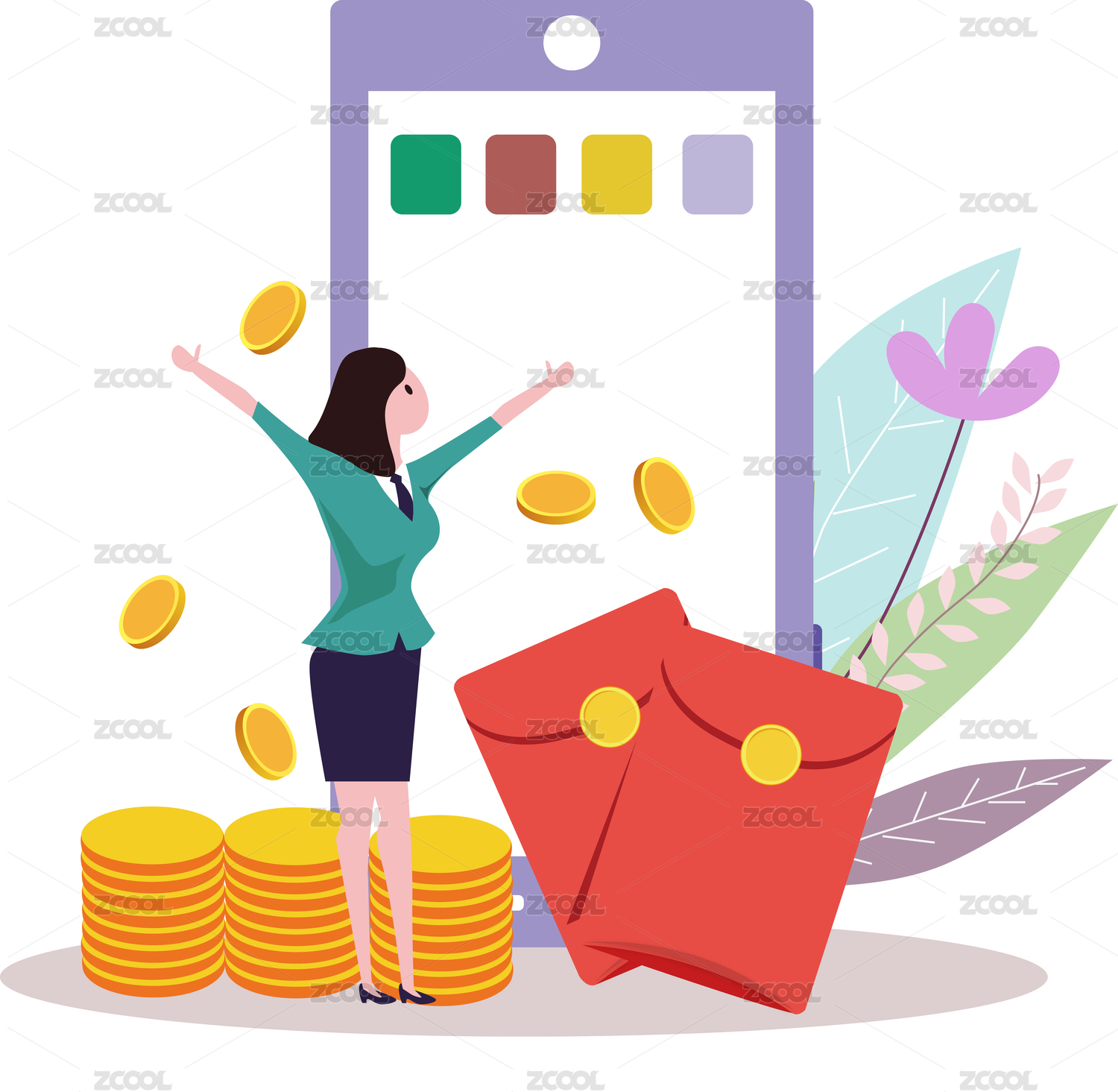 扁平化的人物站在摇钱树前面