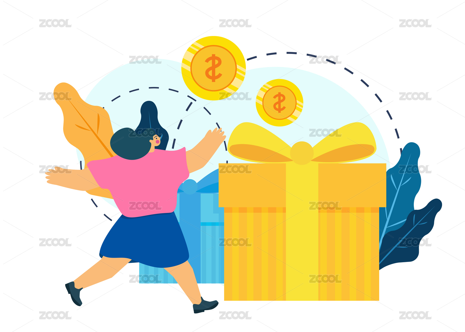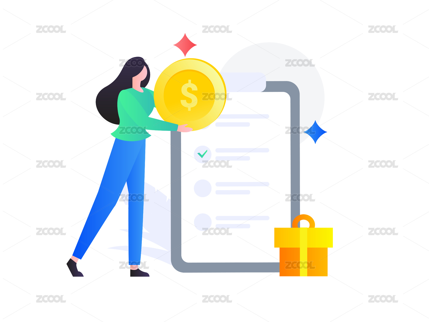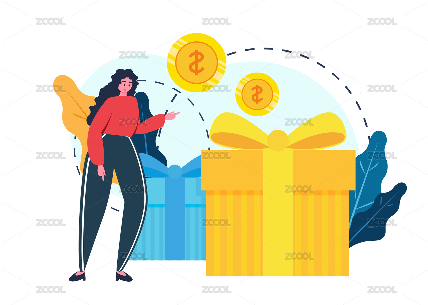 卡通女人拿着金币插画