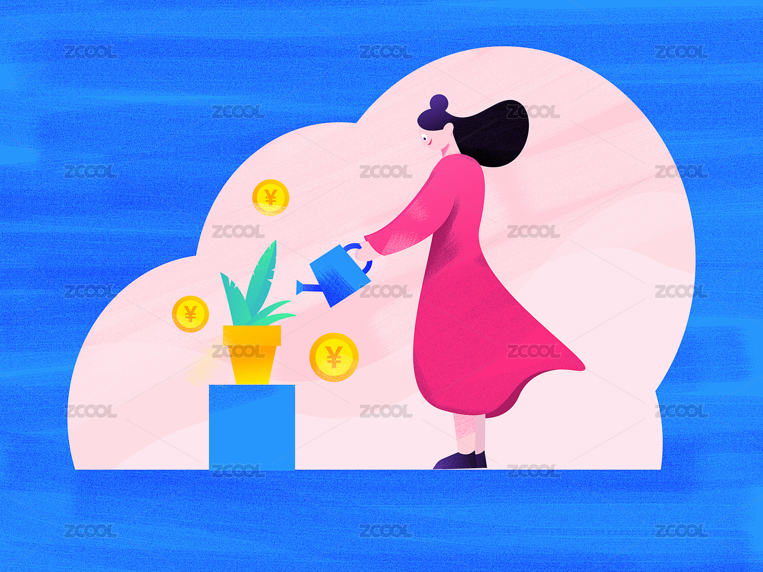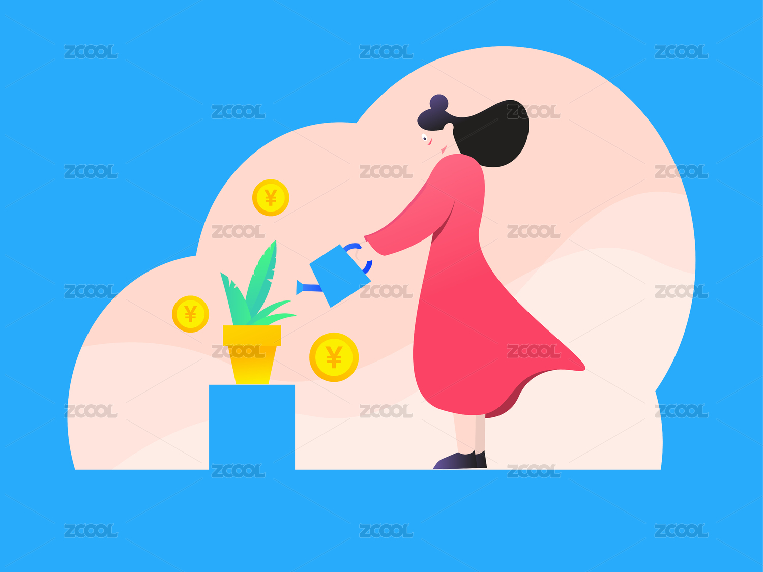 浇花,花草,裙子,女孩,女士,浇水,花盆,钱币,签到,人物