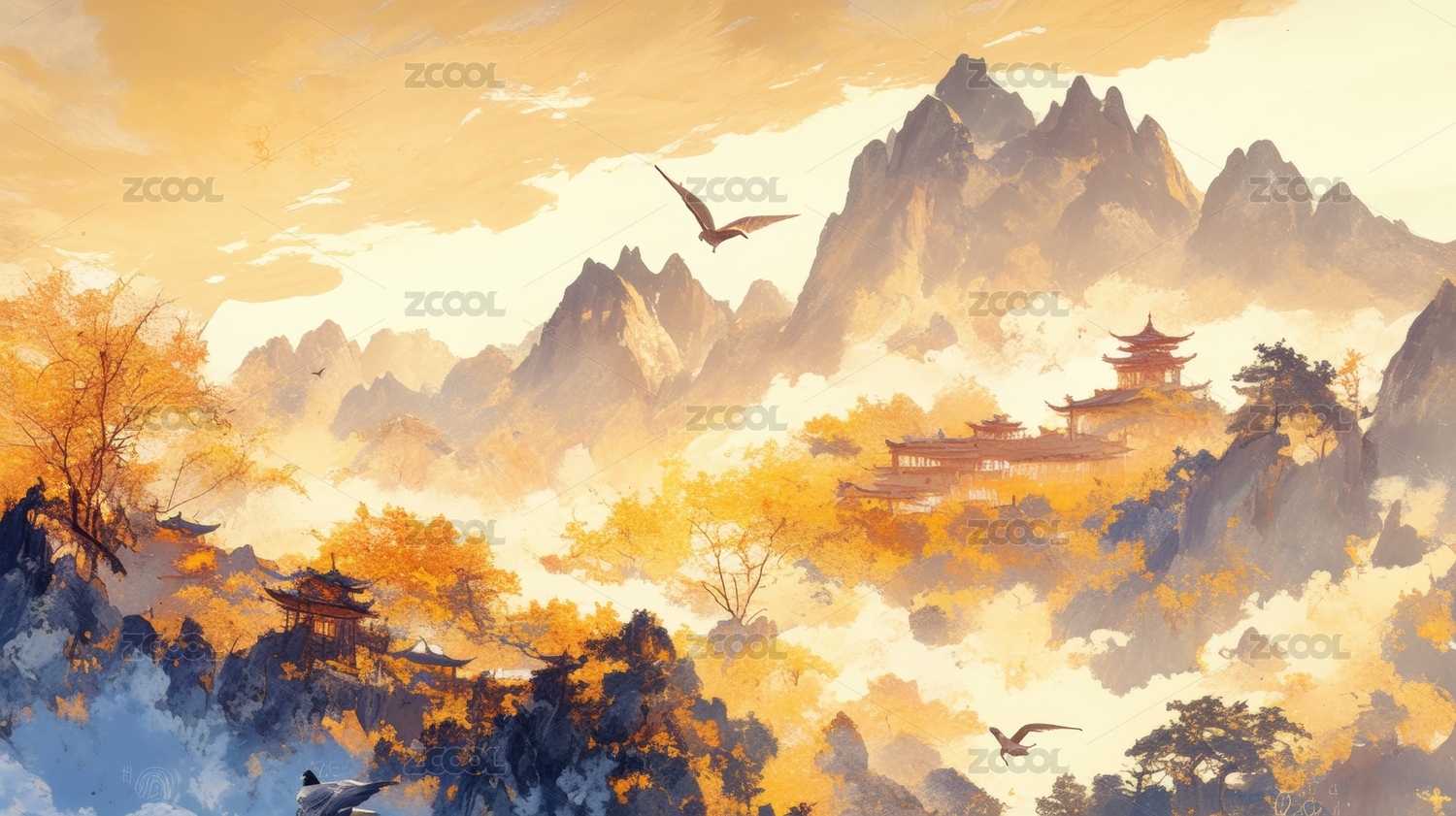 水墨画,秋季,中国画,山水画,红叶,枫叶,山峰,古建筑,云雾,秋天